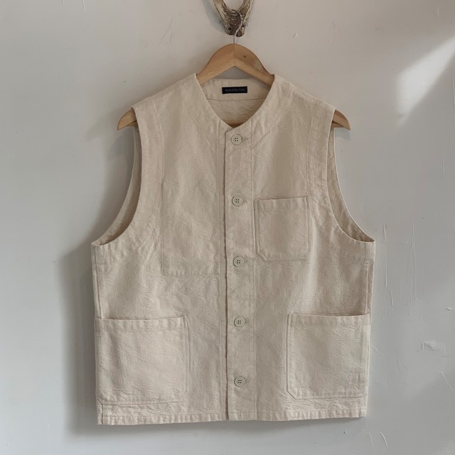 NAPRONオリジナルキルトを使用したノーカラーコートです。 表地は程よく光沢感のあるブロード生地を採用し、着脱のしやすさを考え、 裏地にはポリエステル素材を採用しています。 今季のキルトデザインは、 継ぎ接ぎの襤褸をイメージし、絶妙なサイズ感の長方形を縦に並べたデザインにしています。