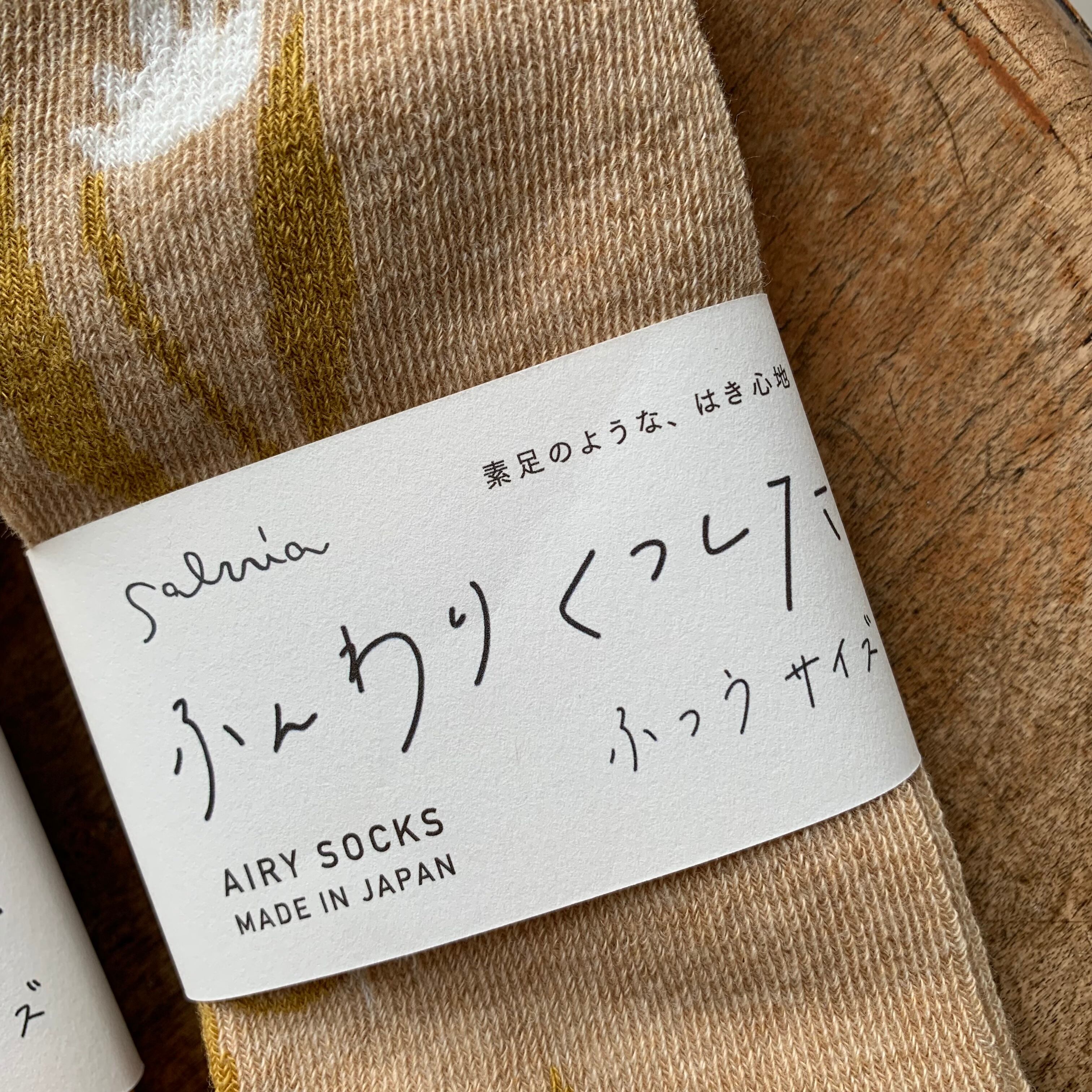 “昔ながらのゆっくり編み”で、素材も手間も時間もたっぷりかけてつくる「ふんわりくつした」は、ゴムが入っていないのでしめつけ感がなく、ふんわりとした履き心地です。