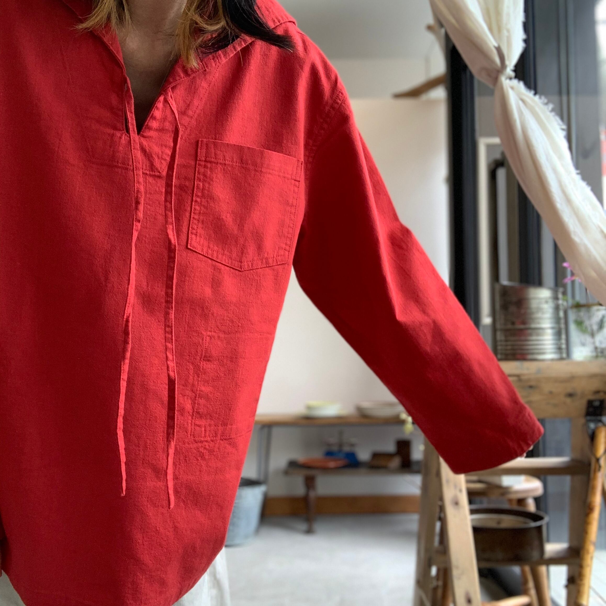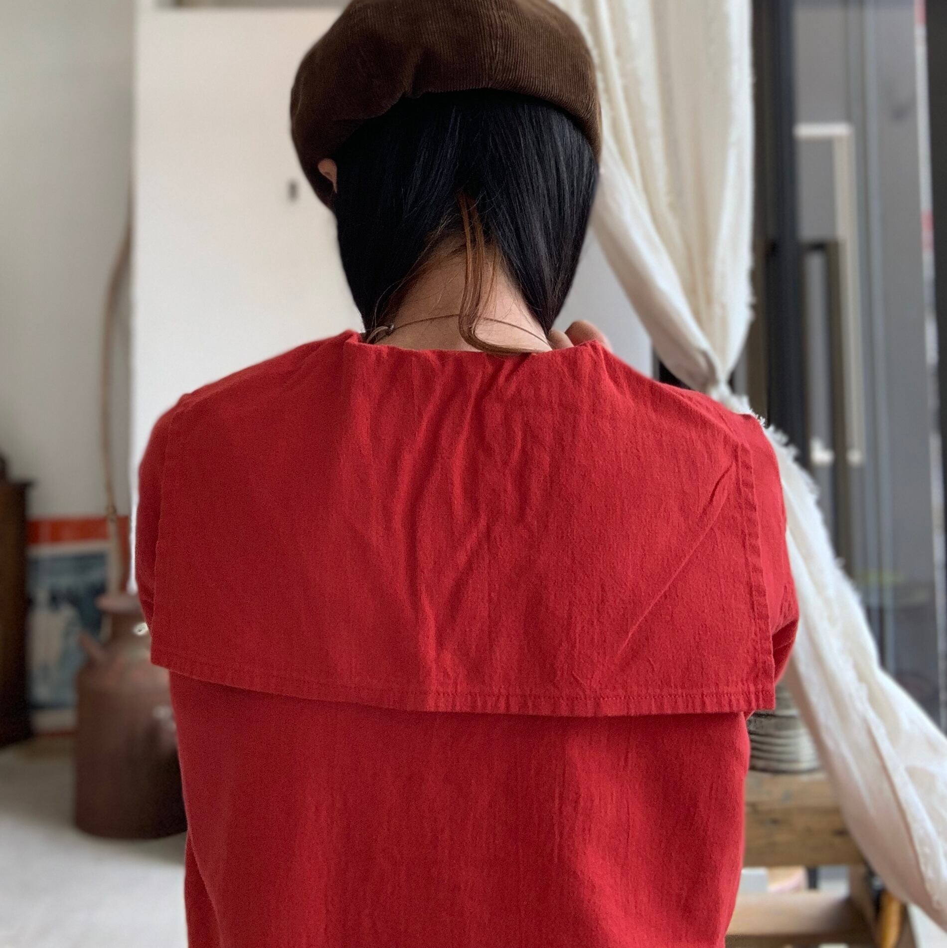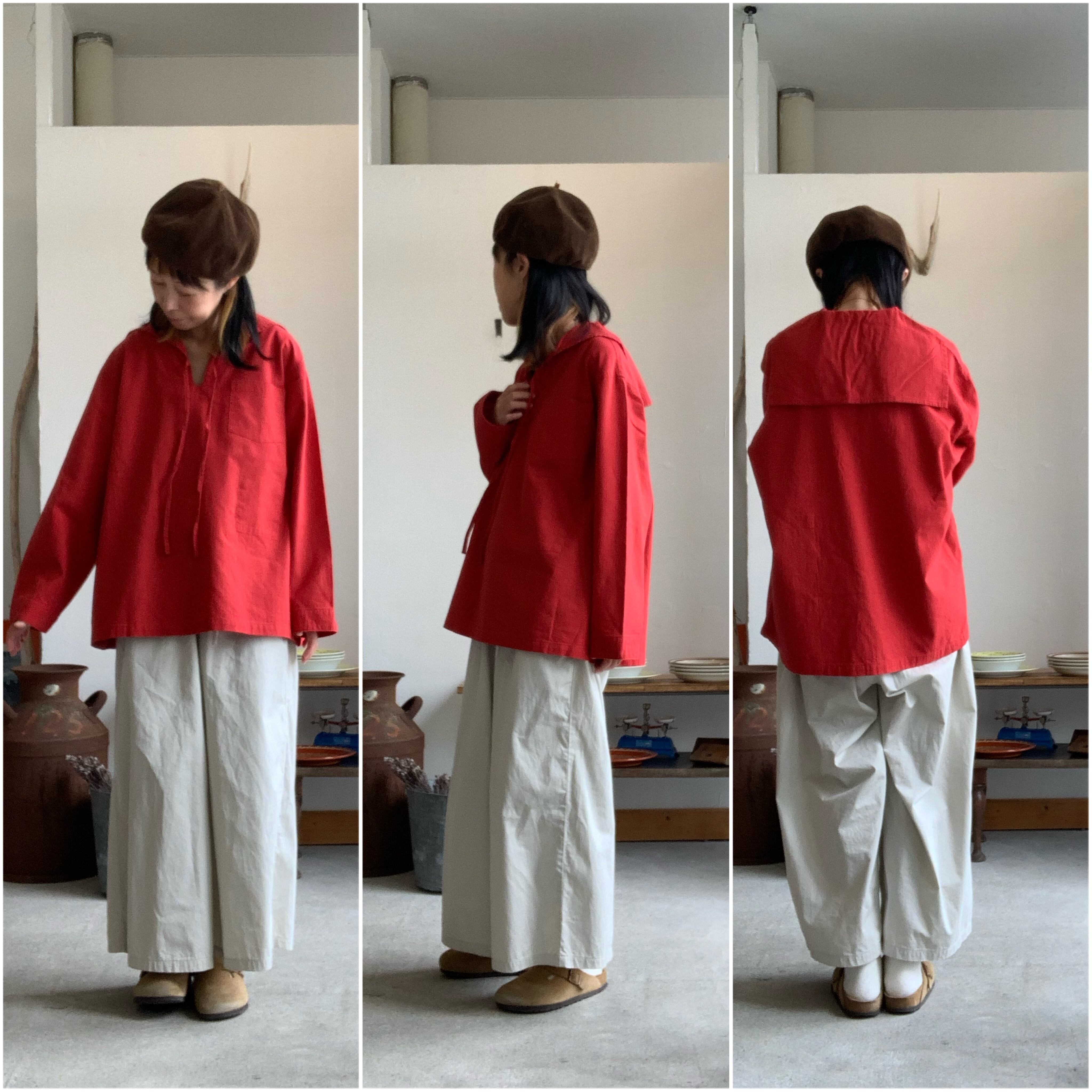 ワッシャー加工を施した綿麻素材を使用しているため、肌触りが良く、ナチュラルなシワ感と着古したような風合いが特徴です。