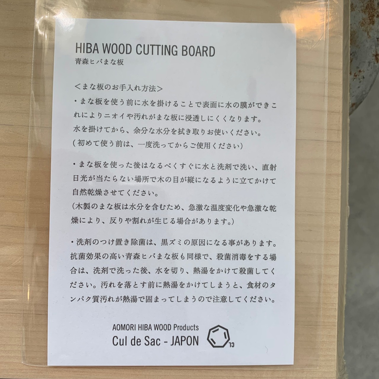 ・洗剤のつけ置き除菌は、黒ズミの原因になる事があります。抗菌効果の高い青森ヒバまな板も同様で、殺菌消毒をする場合は、洗剤で洗った後、水を切り、熱湯をかけて殺菌してください。汚れを落とす前に熱湯をかけてしまうと、食材に含まれるタンパク質が熱湯によって固まってしまうので注意してください。