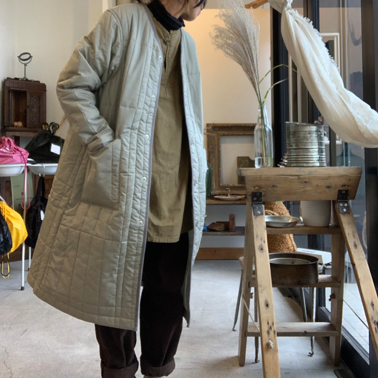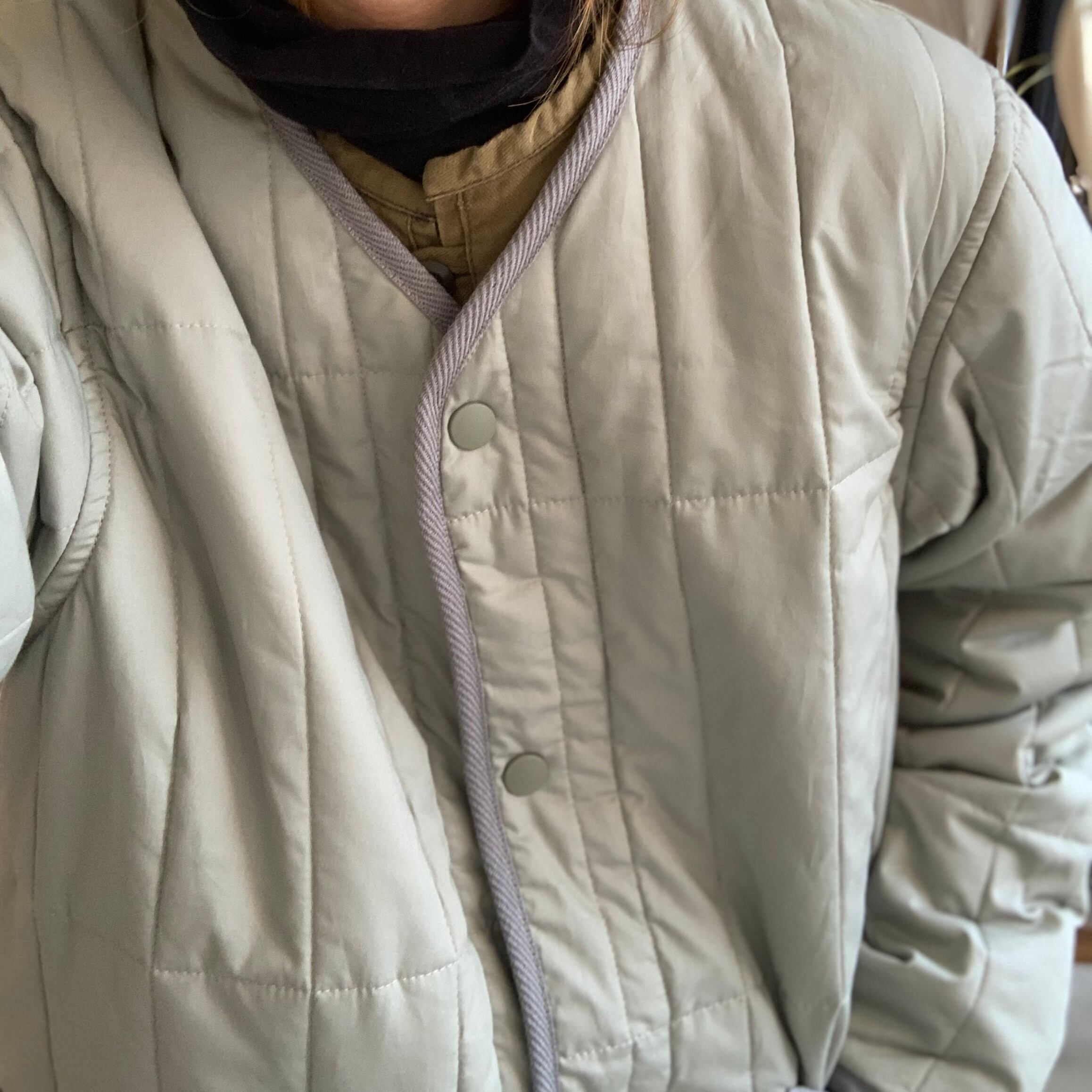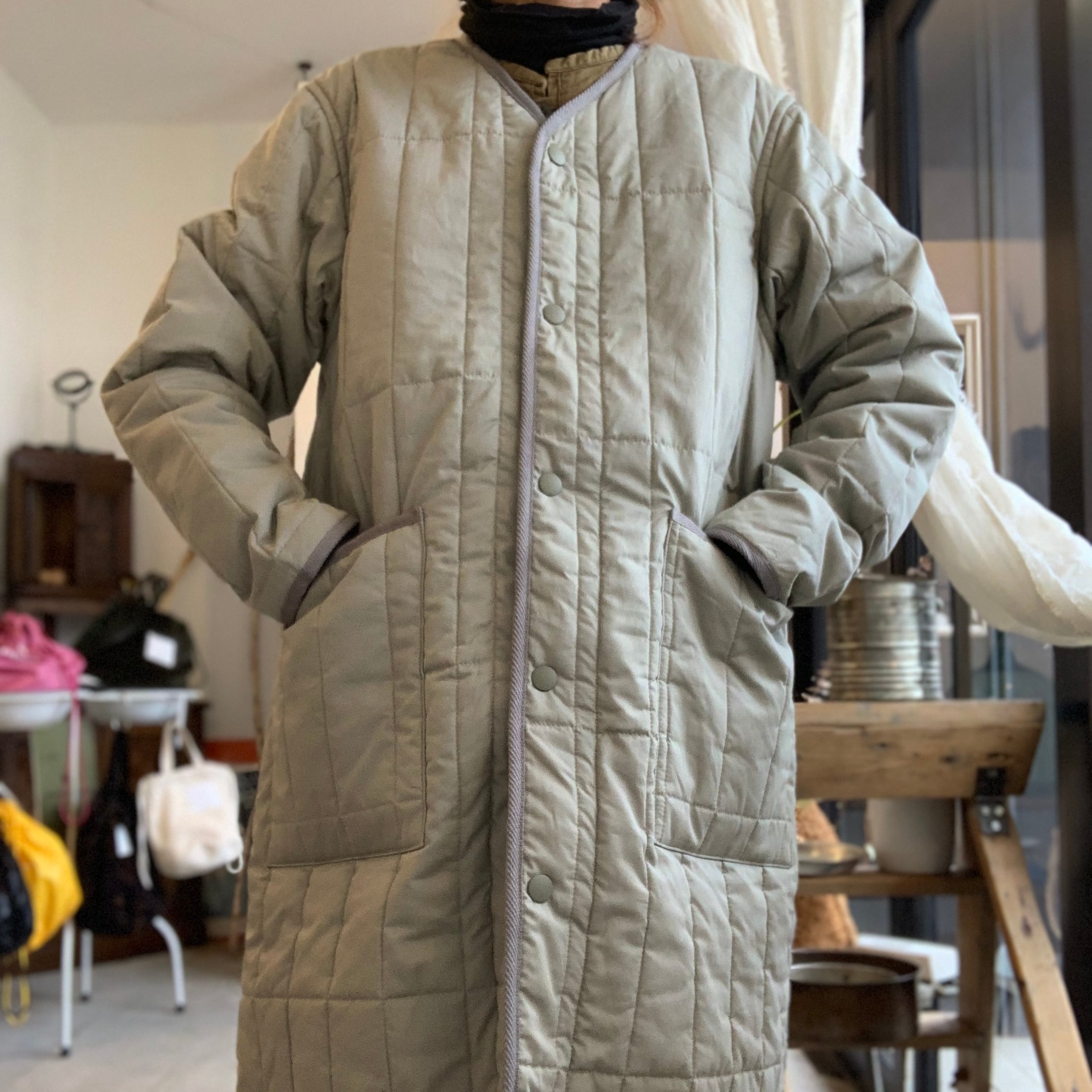 NAPRONオリジナルキルトを使用したノーカラーコートです。