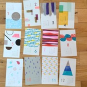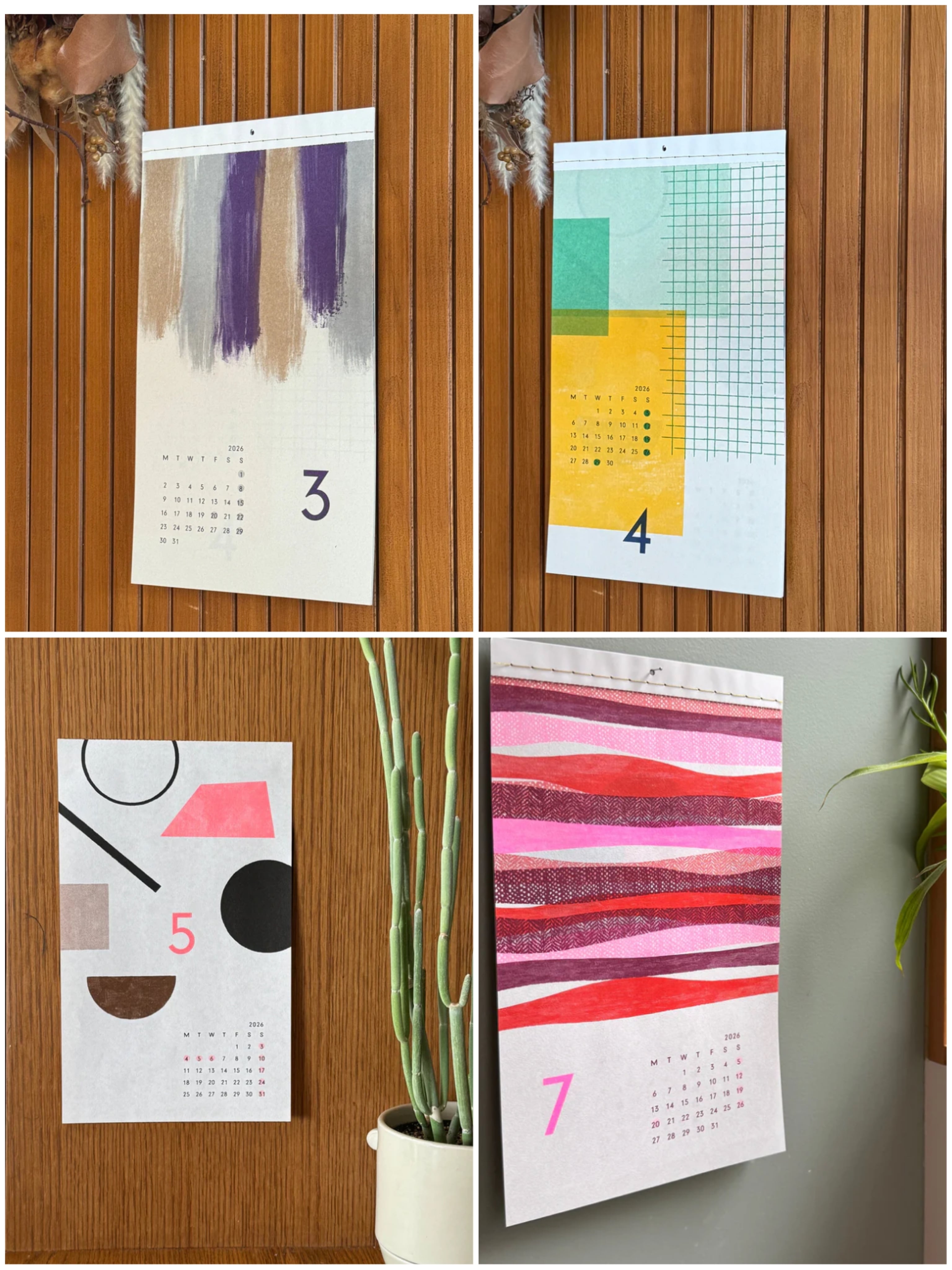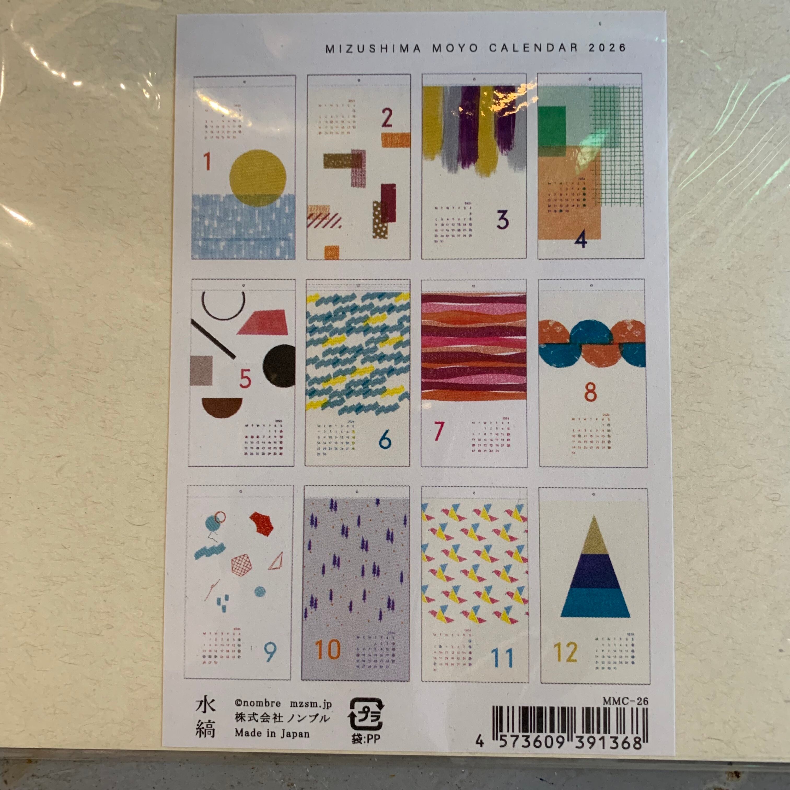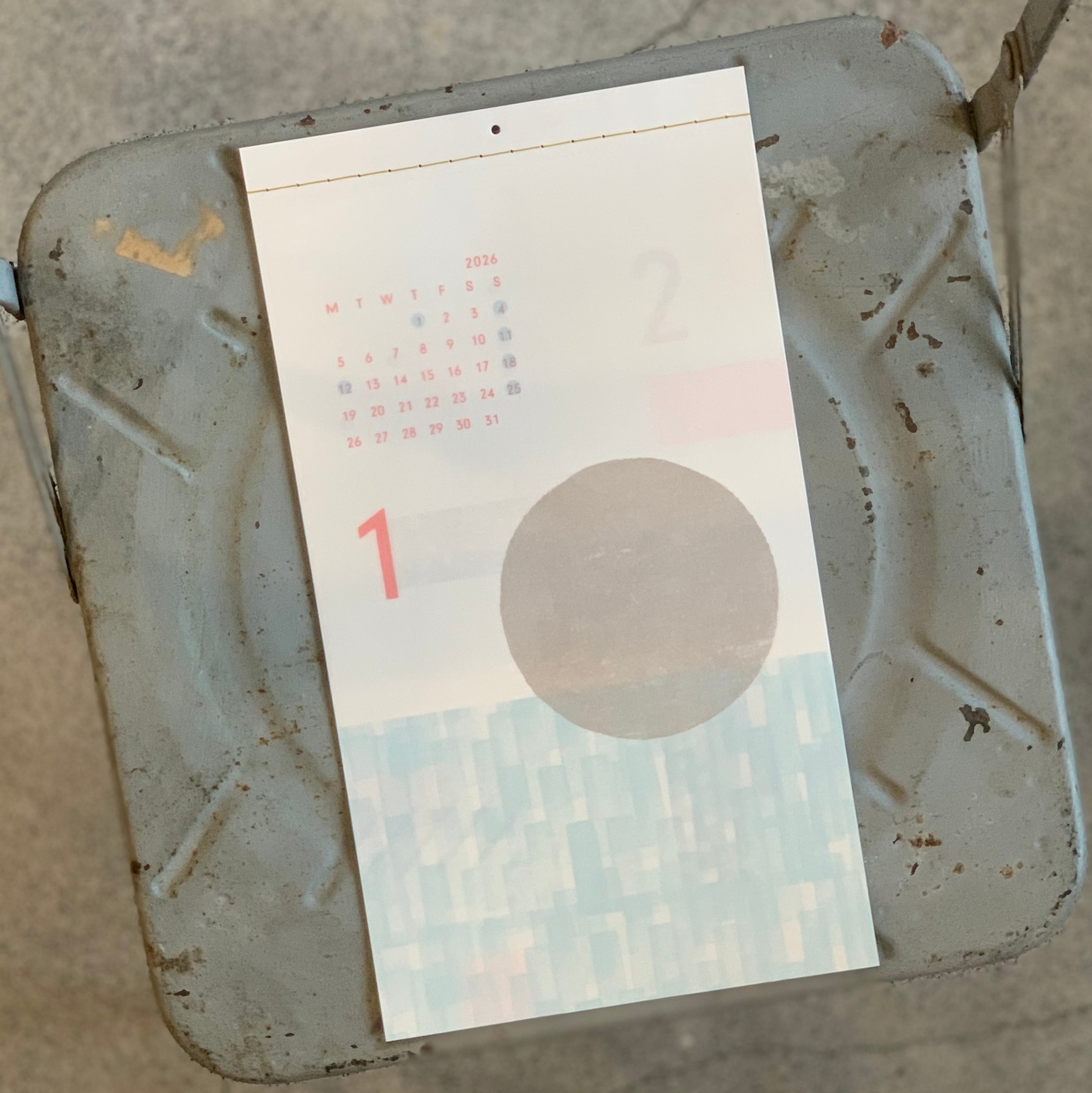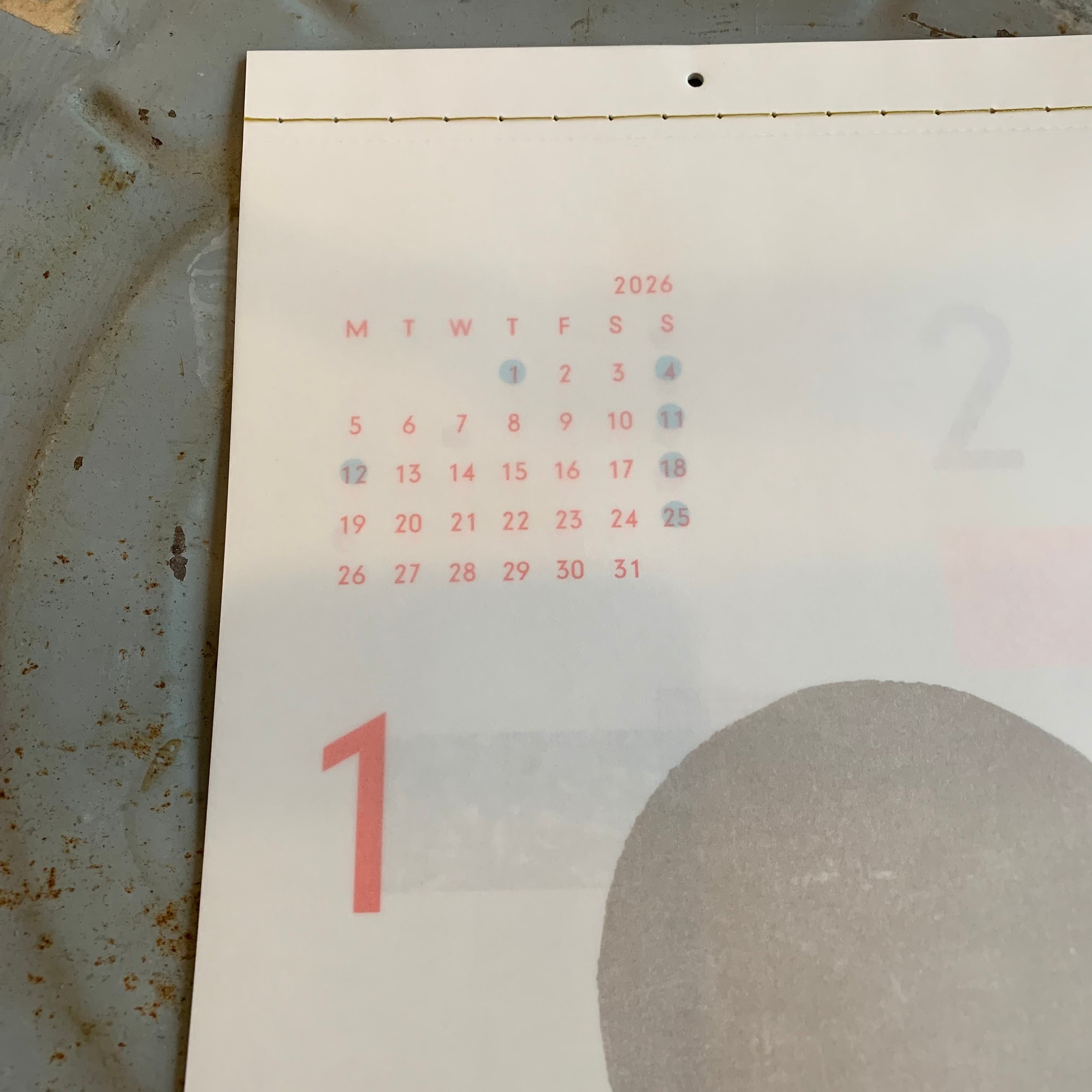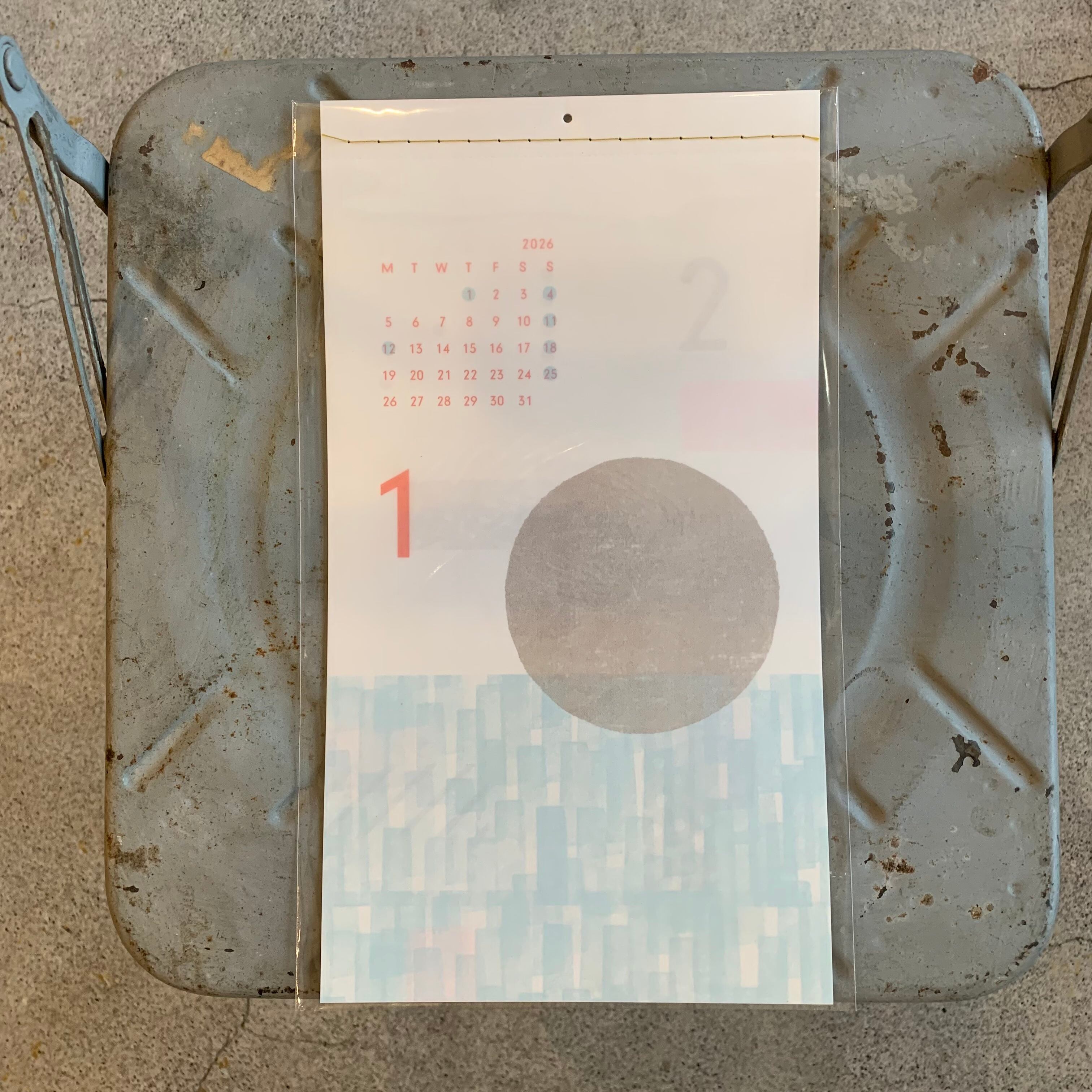 水縞が毎年模様を変えて作っている、月ごとにミシン目で切り離してめくっていくタイプのカレンダーです。毎月変わるグラフィックは、様々な素材をスキャンして作ったテクスチュアや自在ハンコを押して出来たモチーフなど、アナログな素材を掛け合わせてデザインしました。天面に開いた穴を利用してフックで壁にかけたり、切り離したものを壁に直接貼っても素敵です。お部屋のアクセントとして、ちょっとしたアート作品のようにお楽しみいただます。トレーシングペーパーの表紙つき。