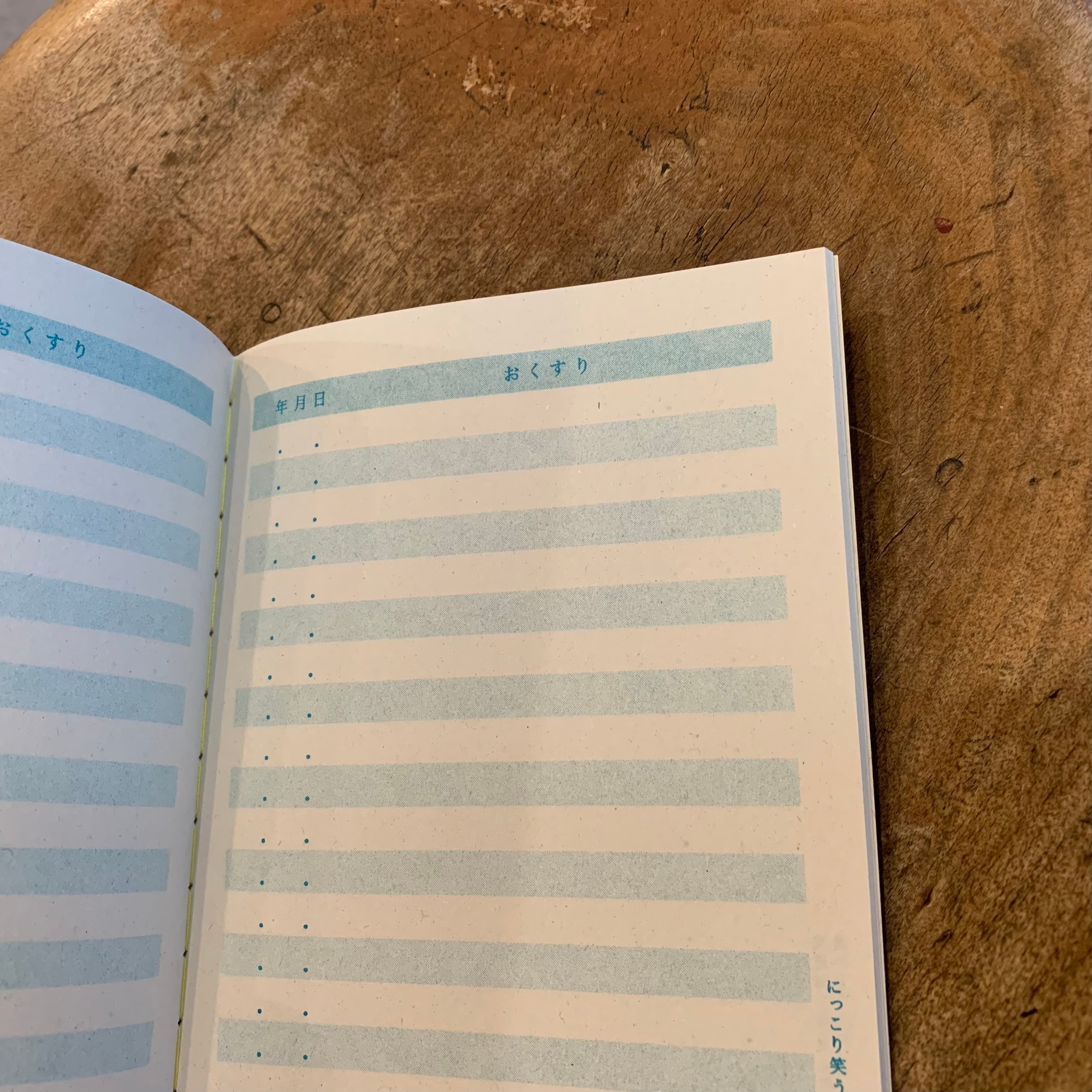 基本情報を各ページに加え、お薬を記録するページには、おはぎやまのイラストと共に、ほっこりとするコメントやちょっとした健康へのヒントが書かれています。