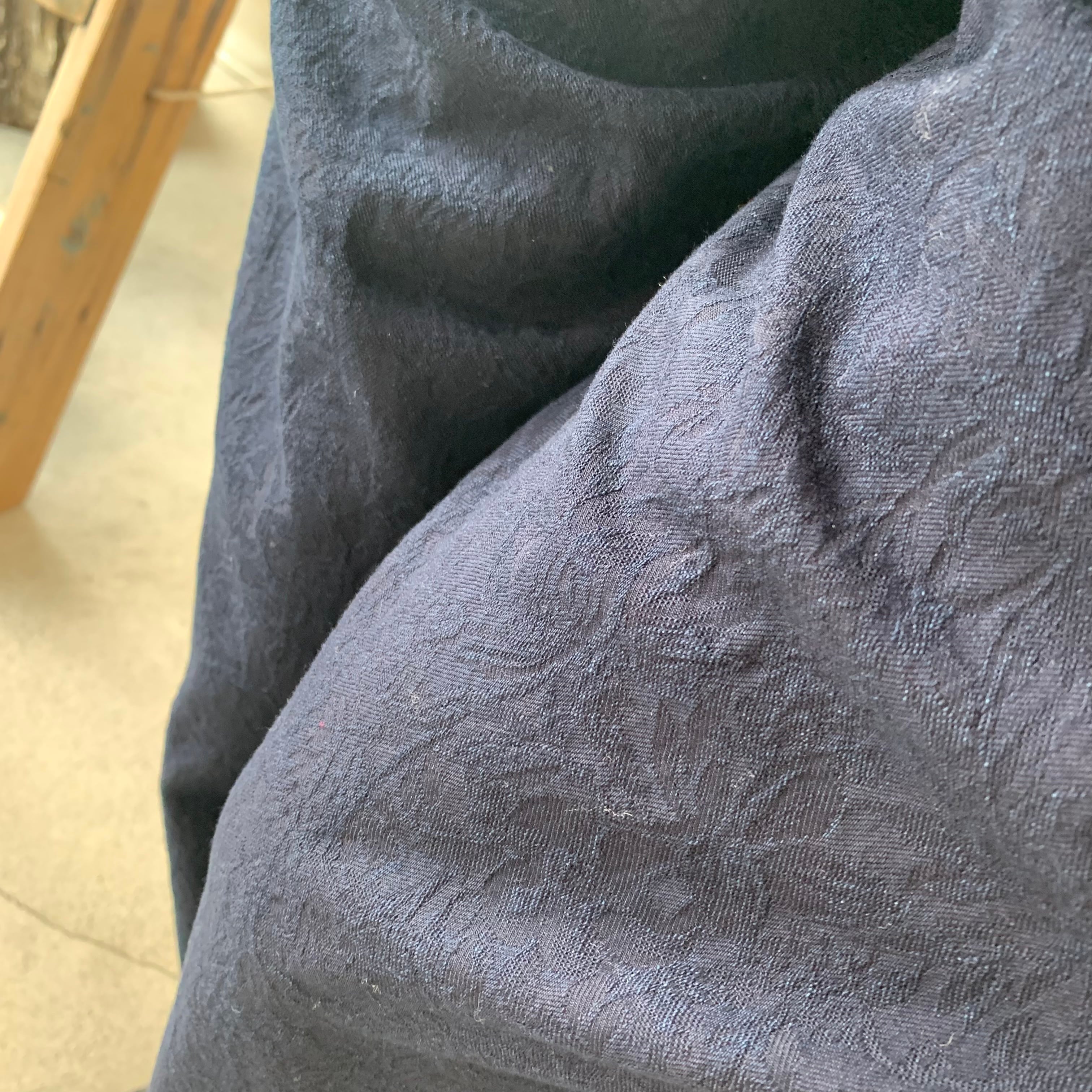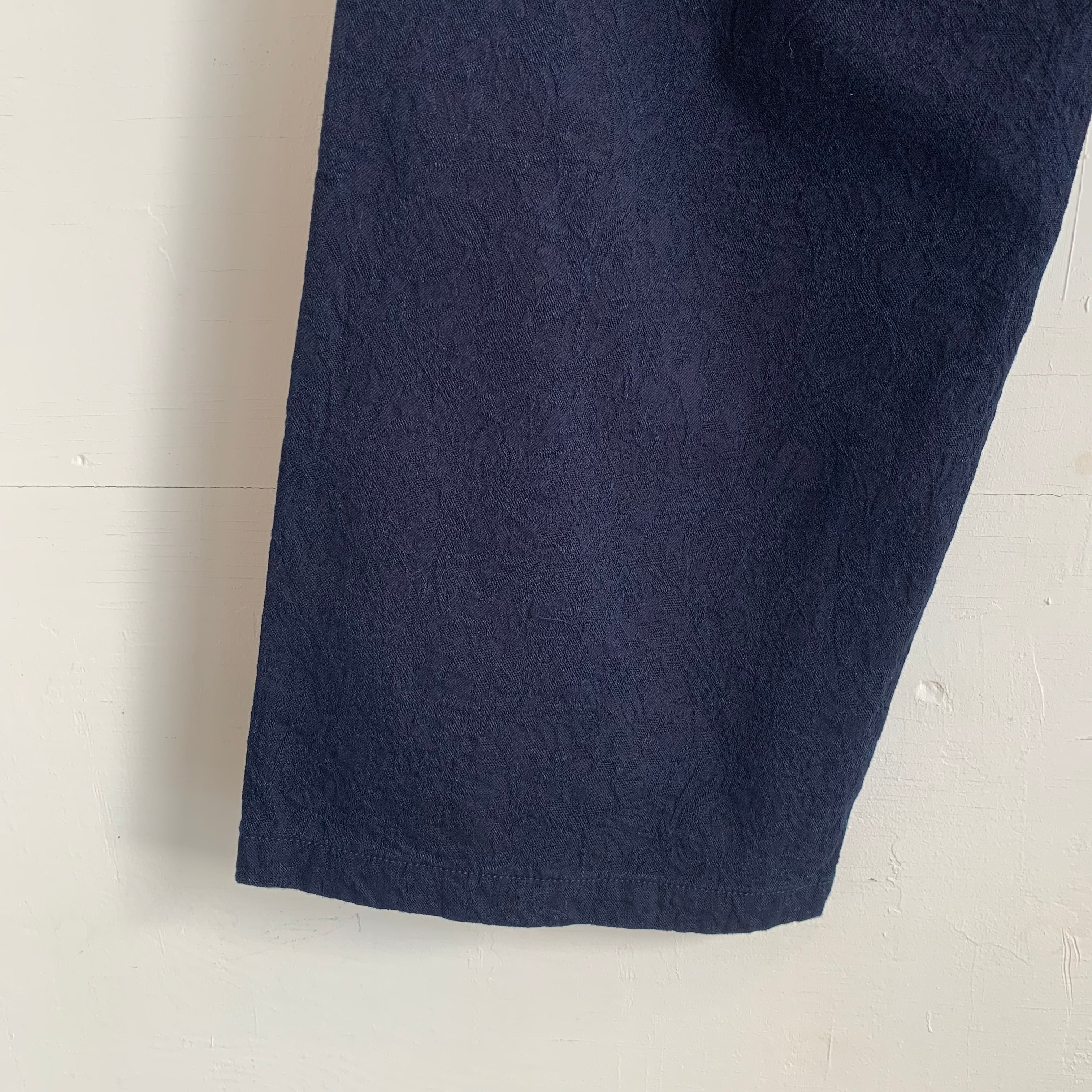 NAPRONオリジナルの植物柄ジャガード生地を春夏でも着用できる薄手生地で作成しています。デニムのように洗いを繰り返すことで色味が変化していくため、経年変化も楽しめます。