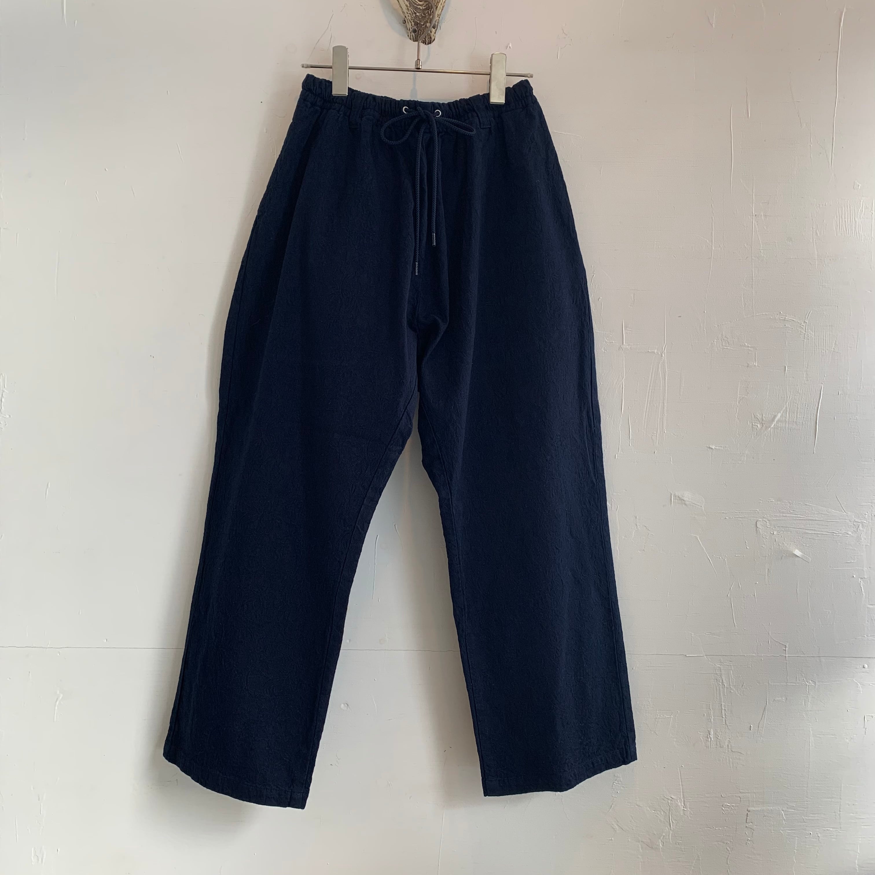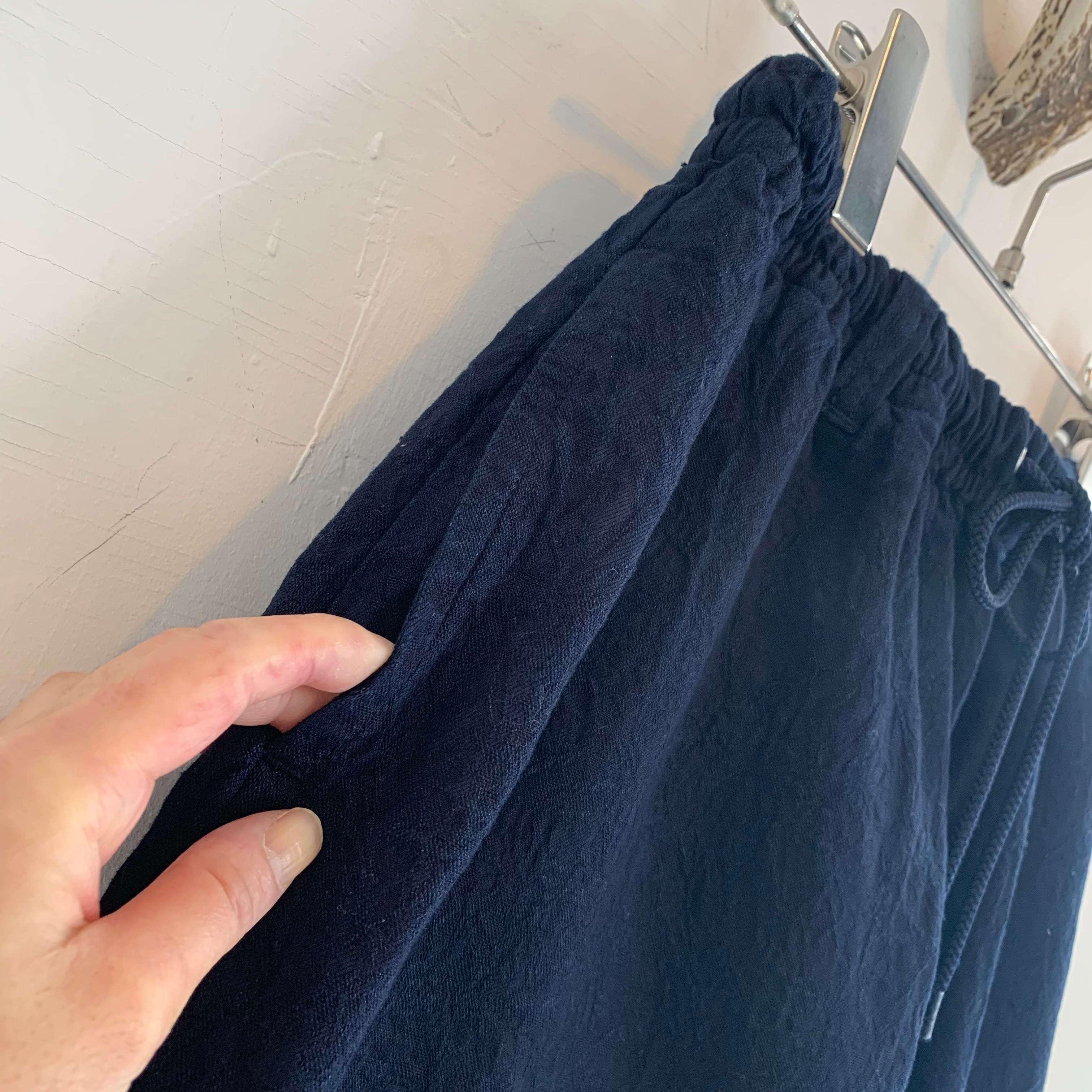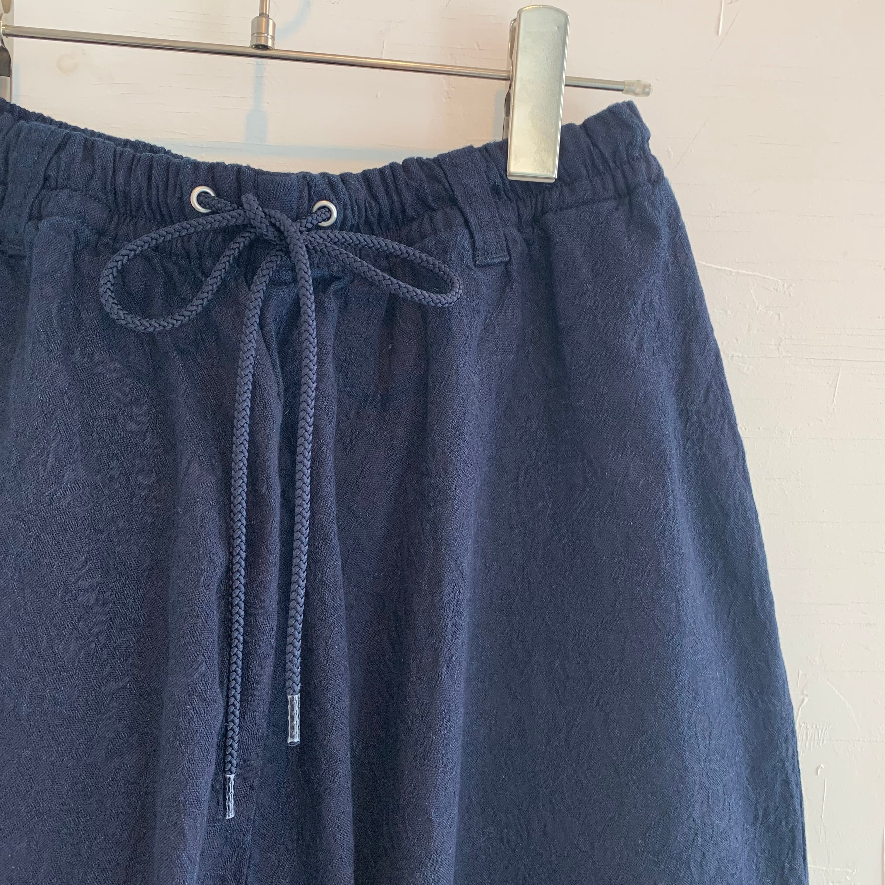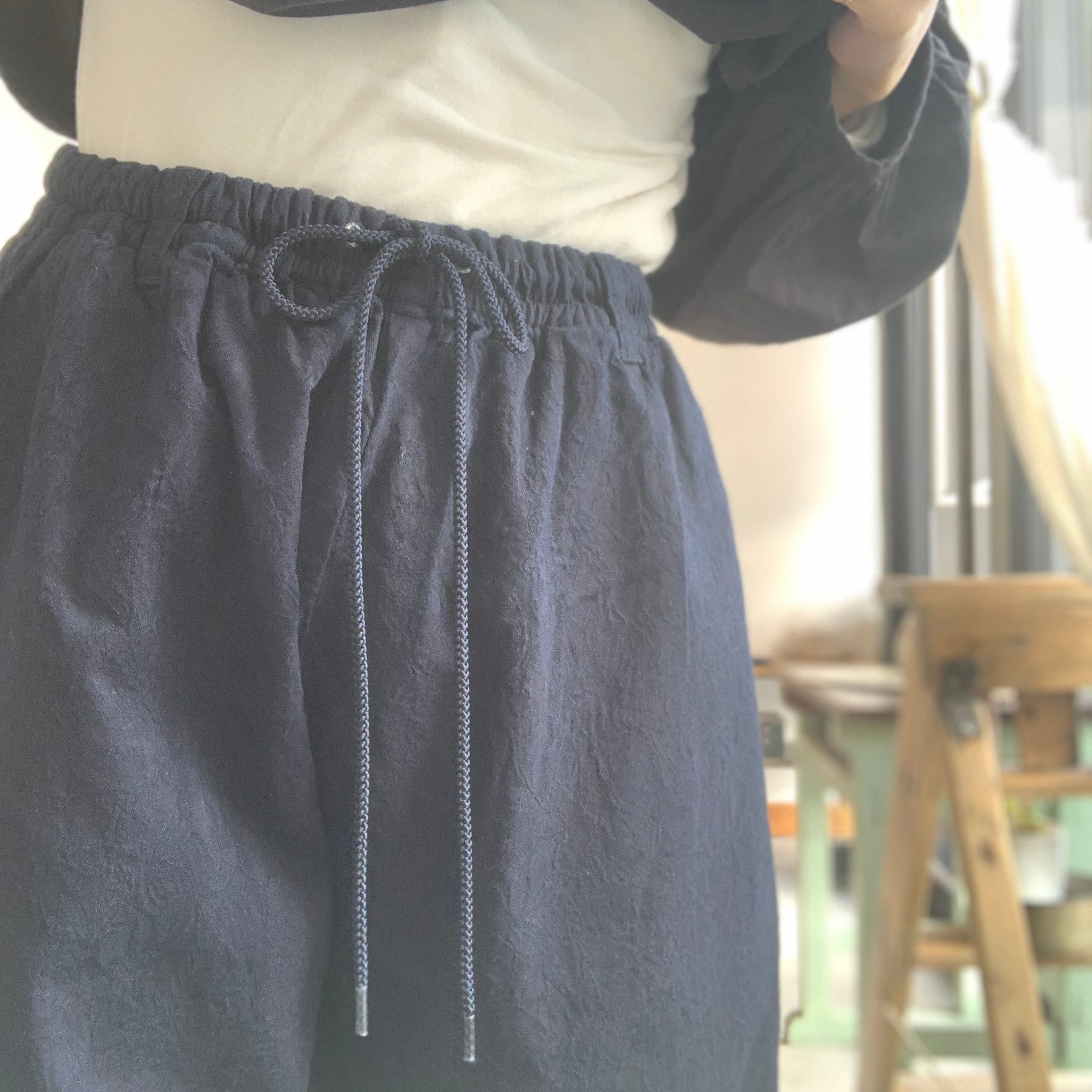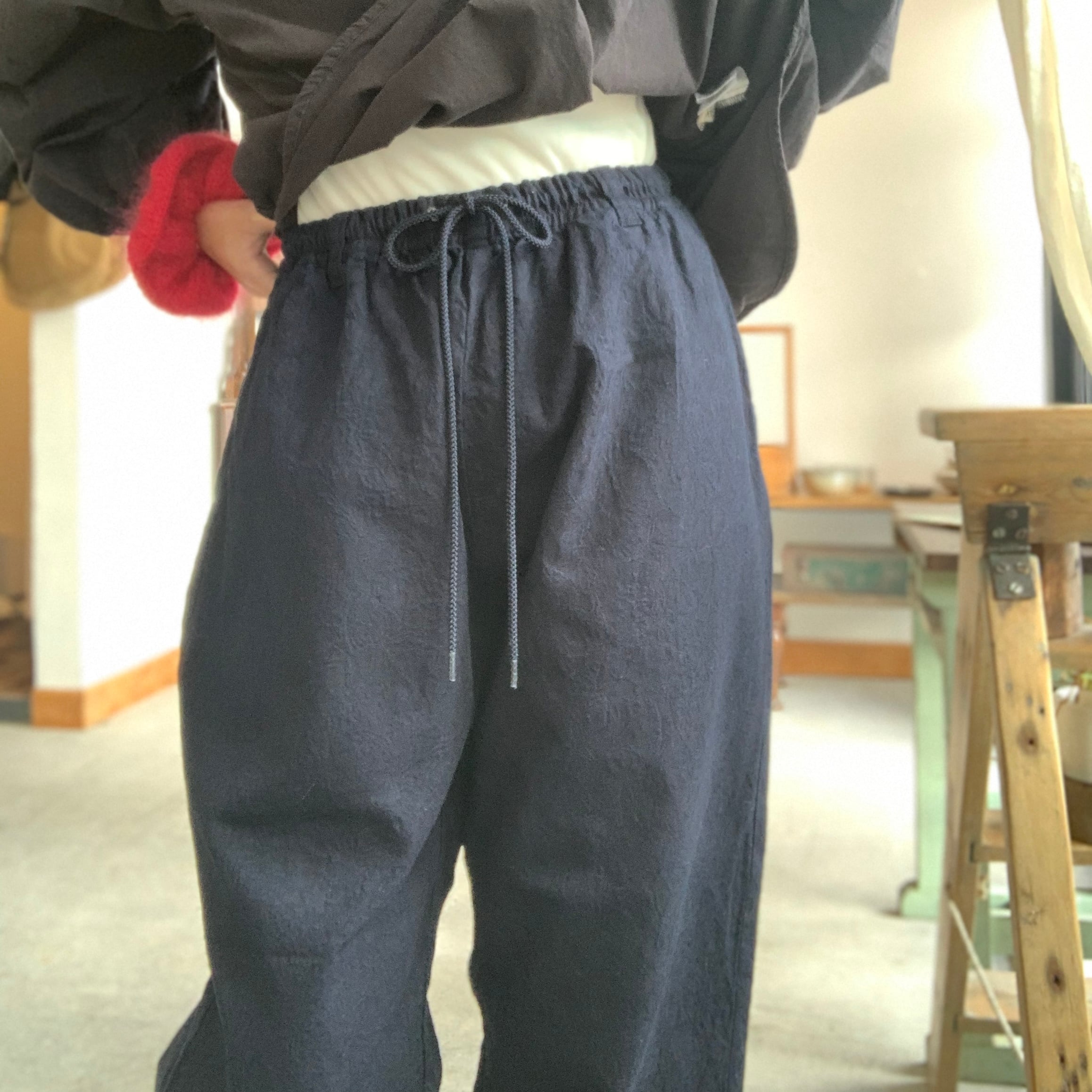 ゆったりとしたテーパードシルエットが特徴で、ウエストはゴムと紐で調整が可能です。