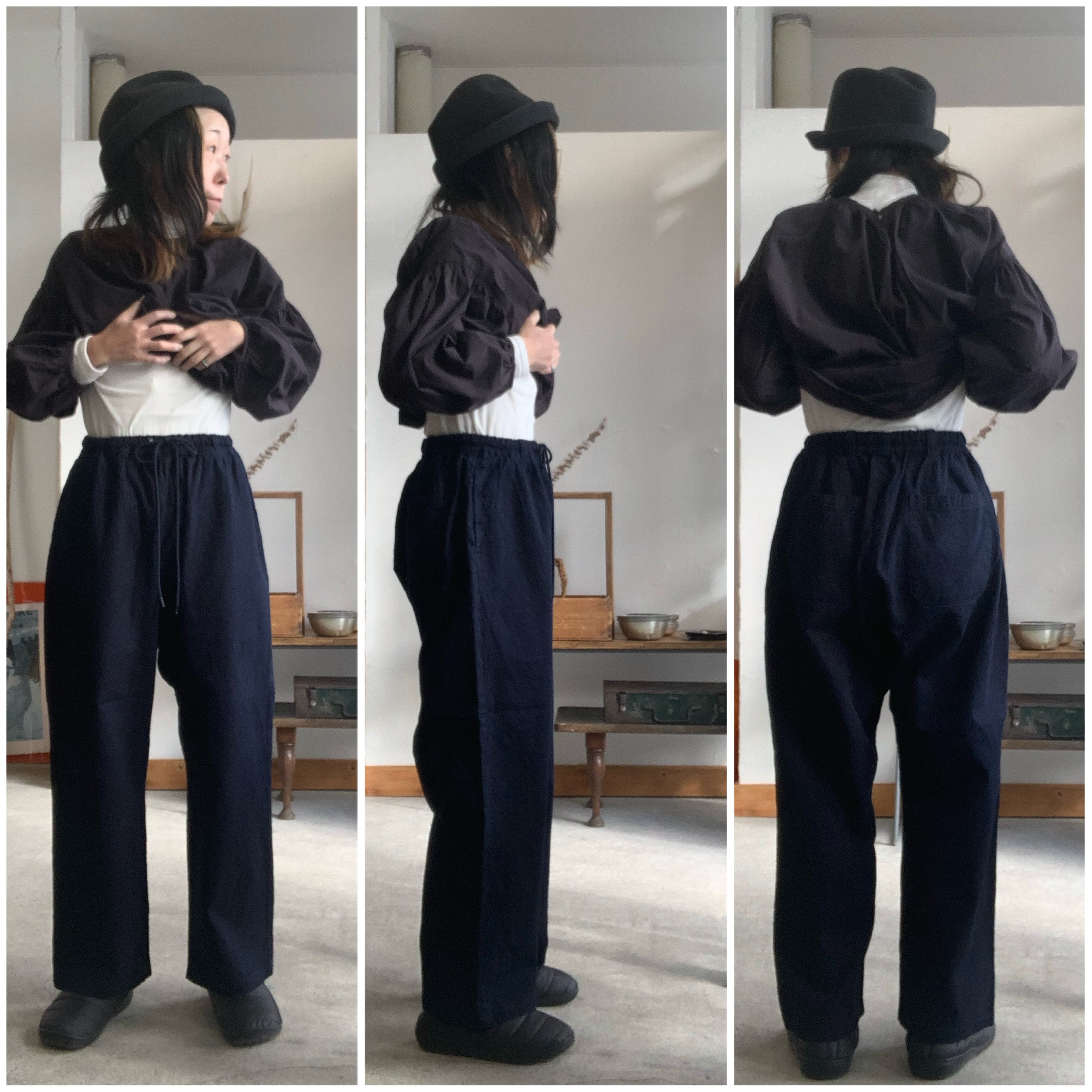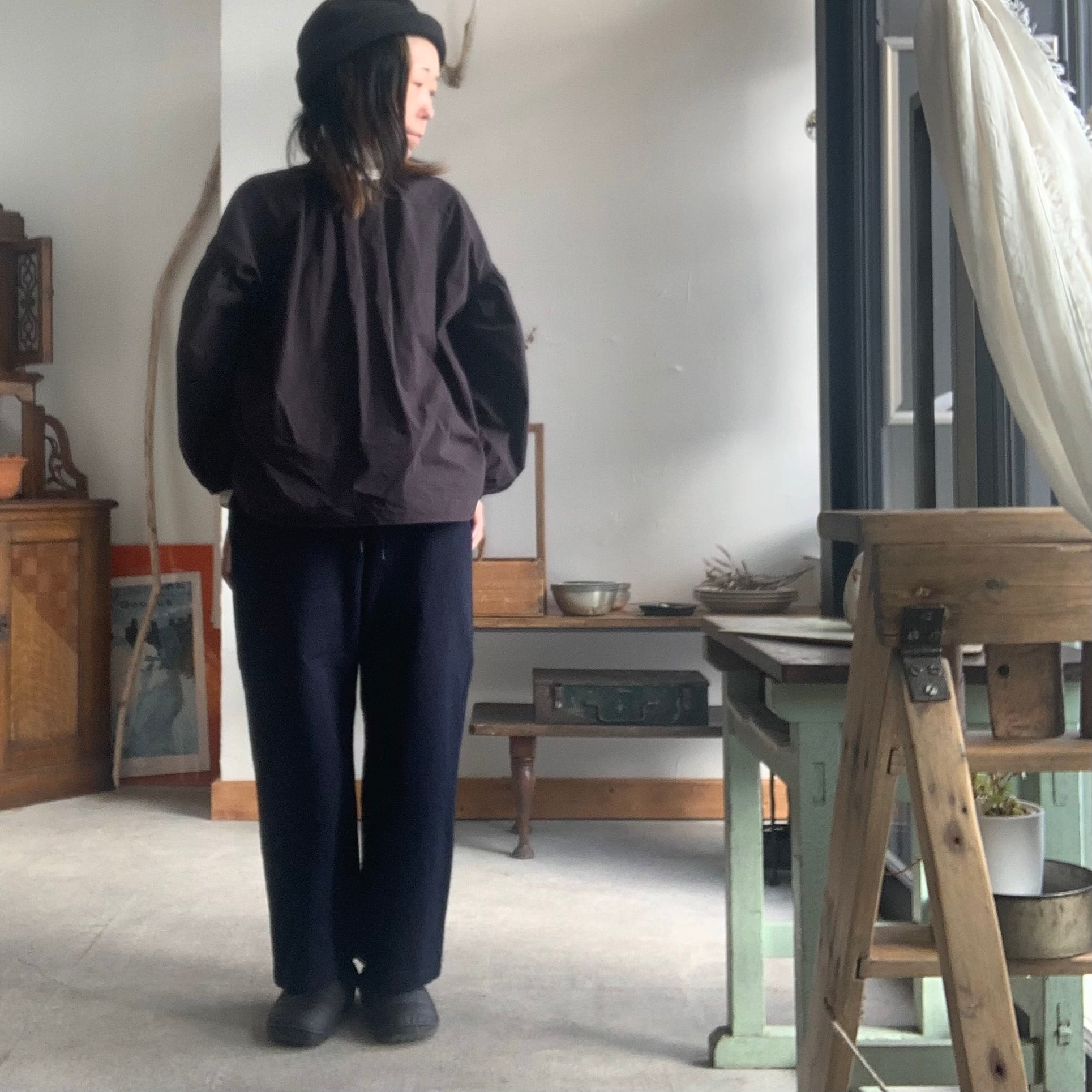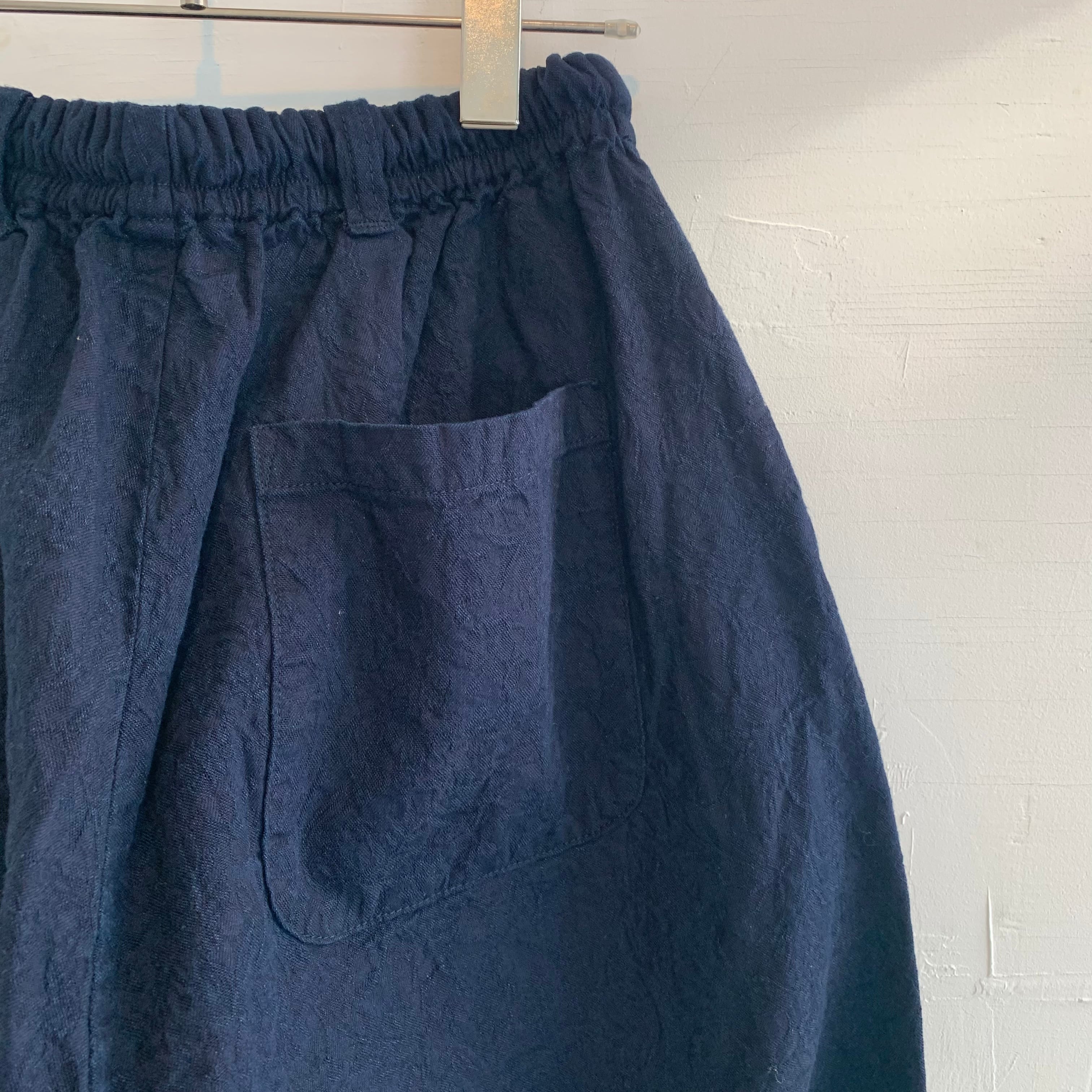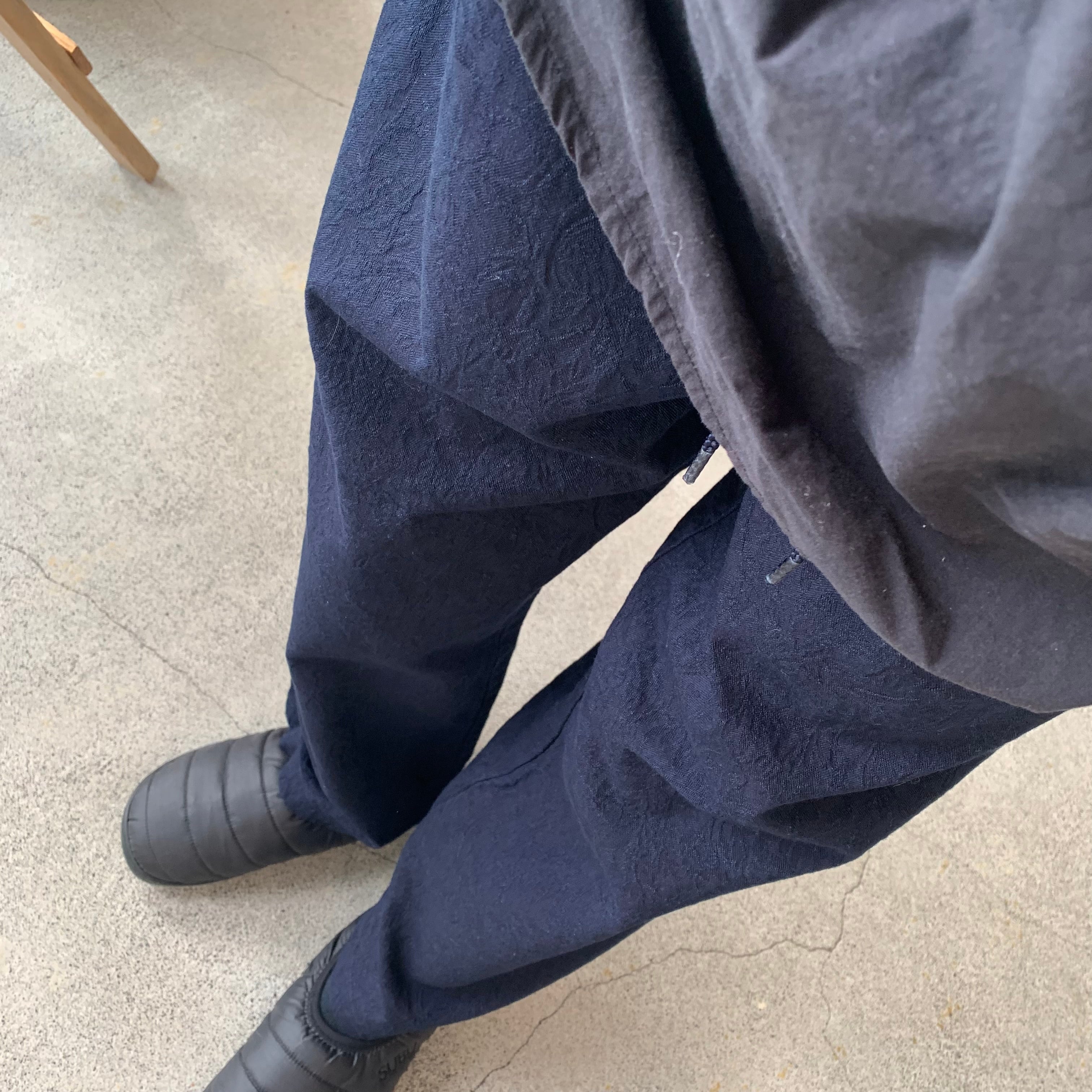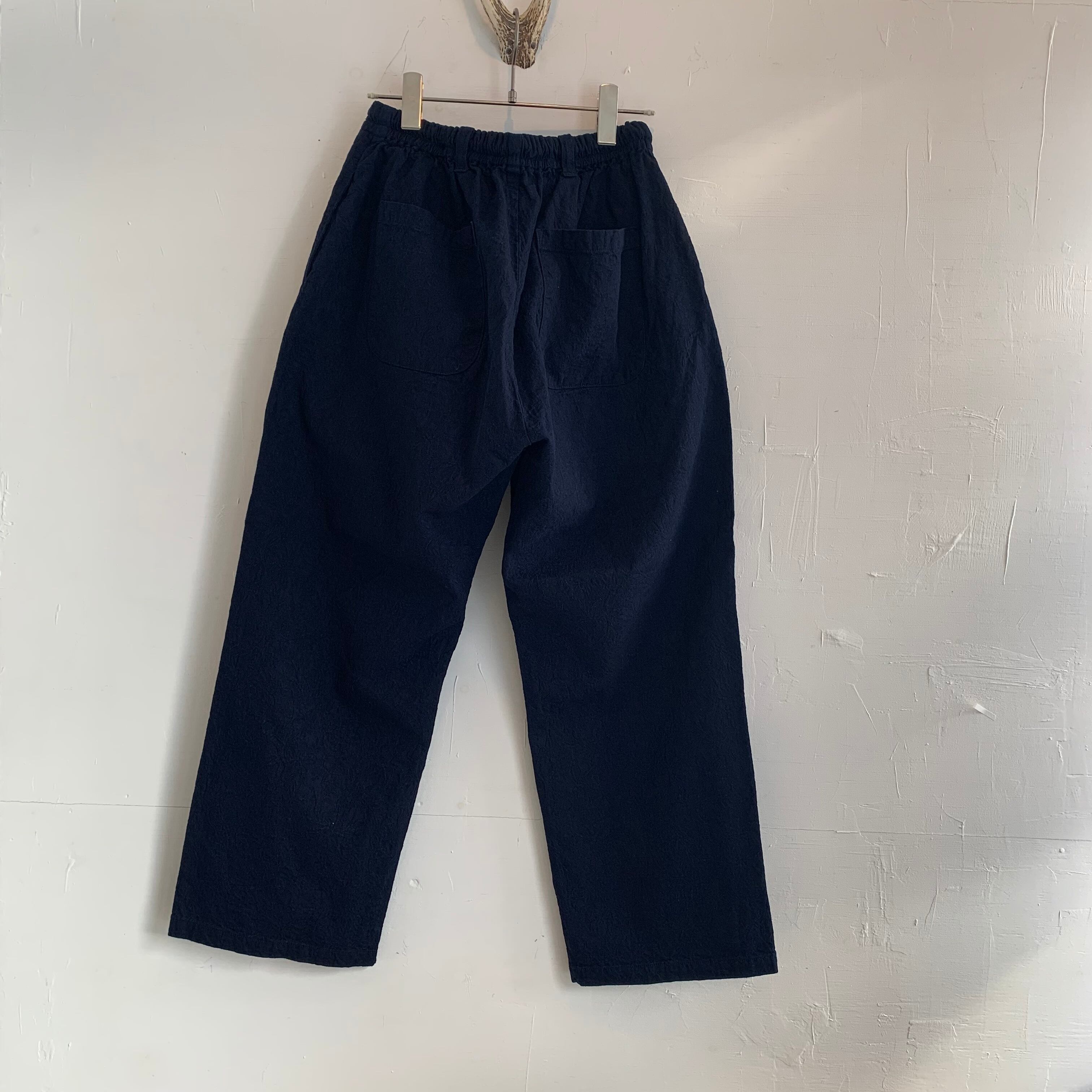 ゆったりとしたテーパードシルエットが特徴で、ウエストはゴムと紐で調整が可能です。