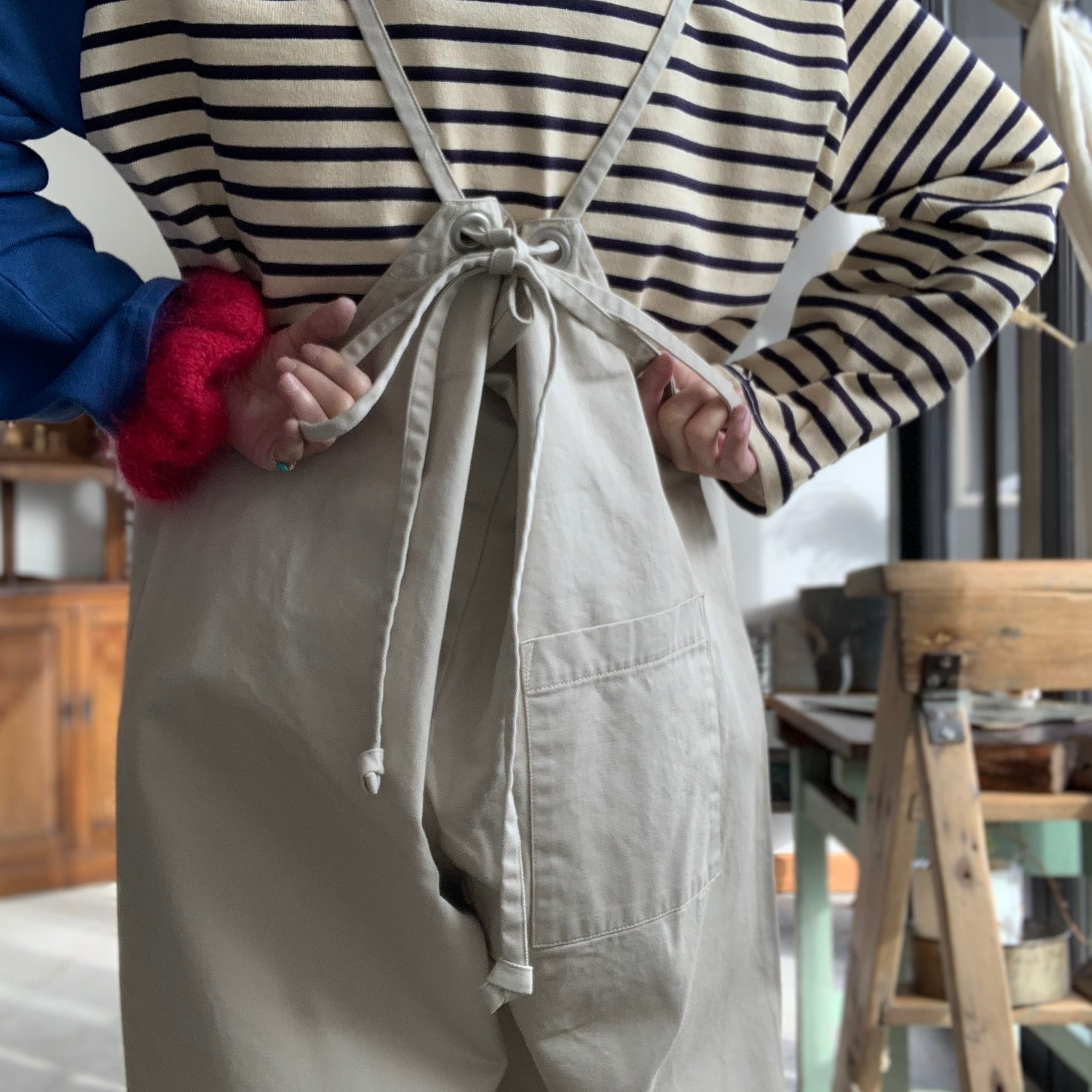 SPLIT APRON同様に、肩細の結び具合で長さを調整することができ、