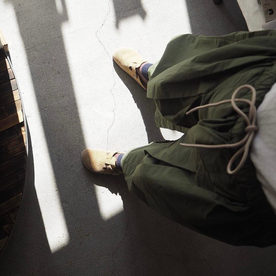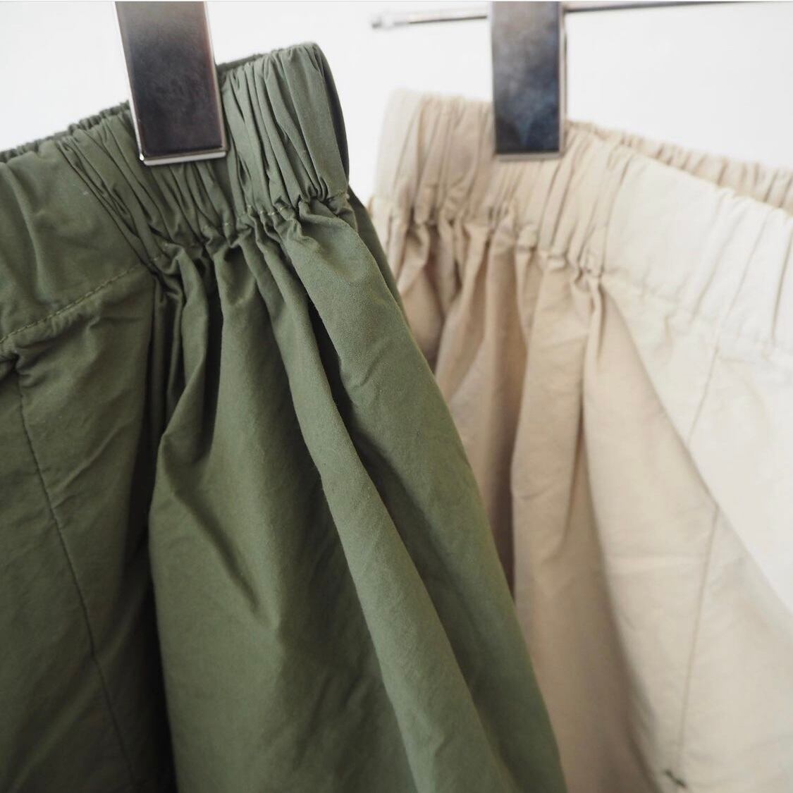 裾のスナップボタンでスカートからパンツへと変わるデザインです。ボリュームがあり、独特なシルエットが特徴。