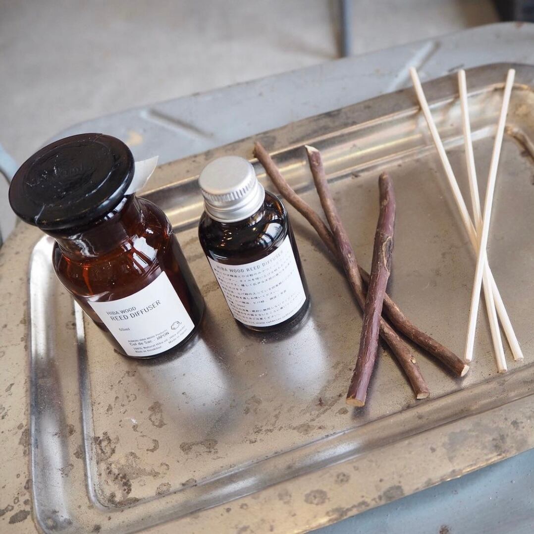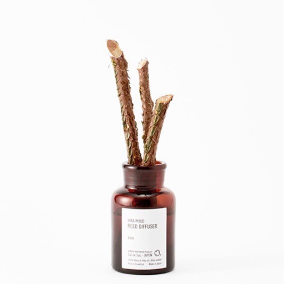 贅沢にヒバ精油とヒバ粉のみでつくったリードディフューザー。オイルを吸い上げる枝も、もちろんヒバ。優しく広がる天然の香りを楽しめます。