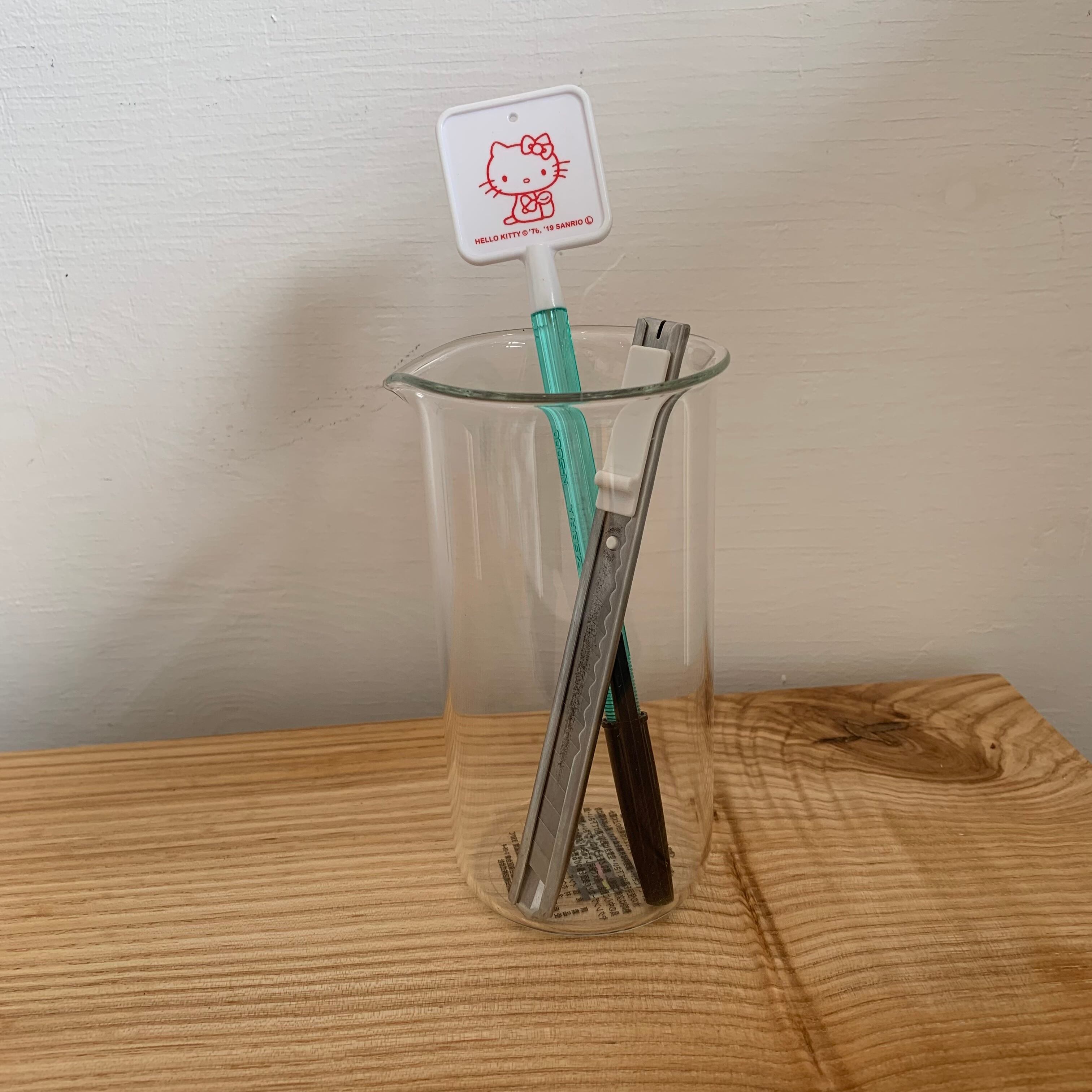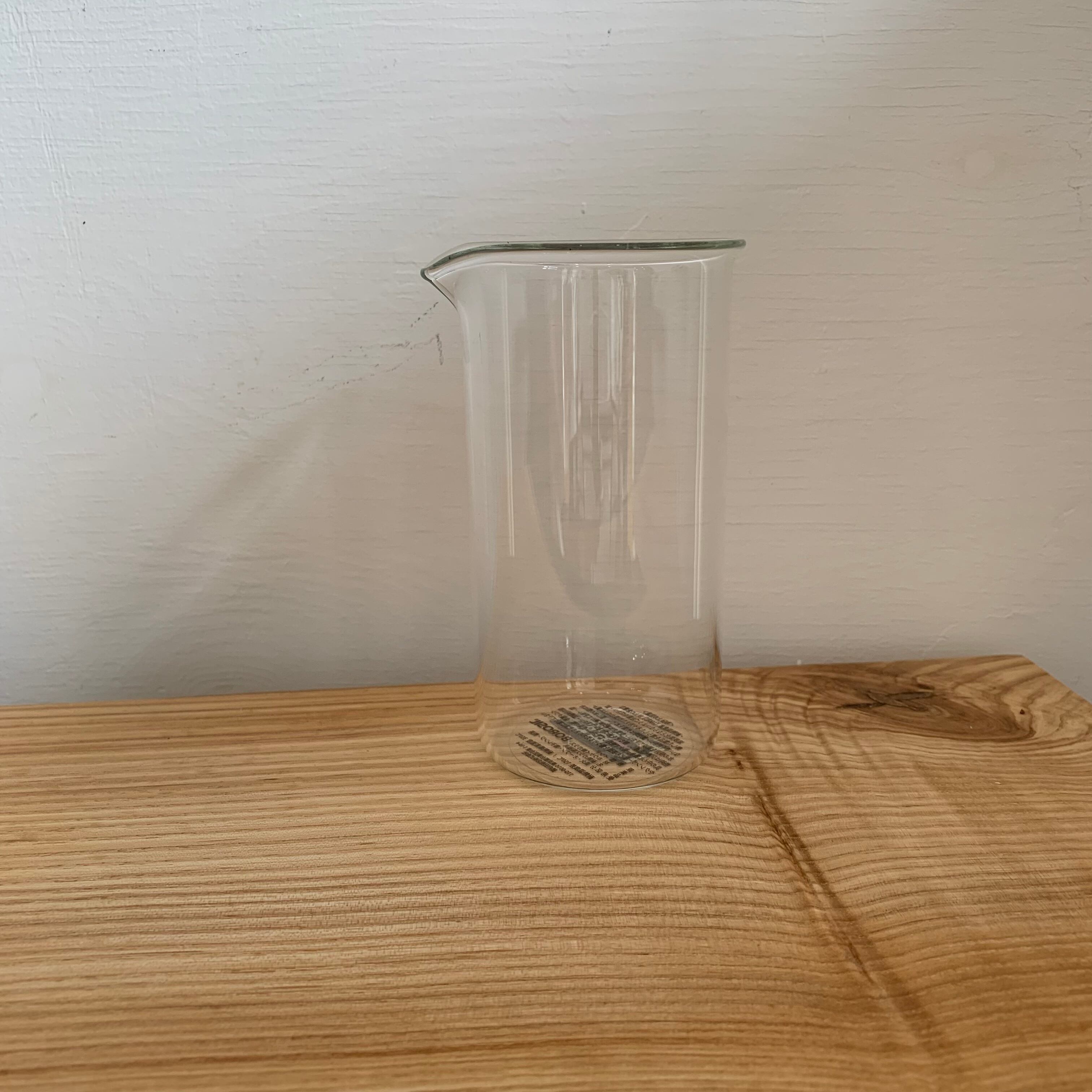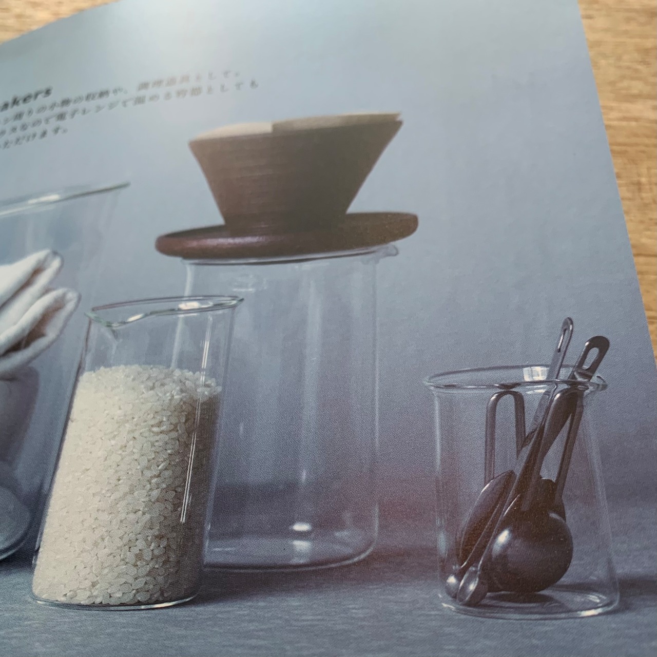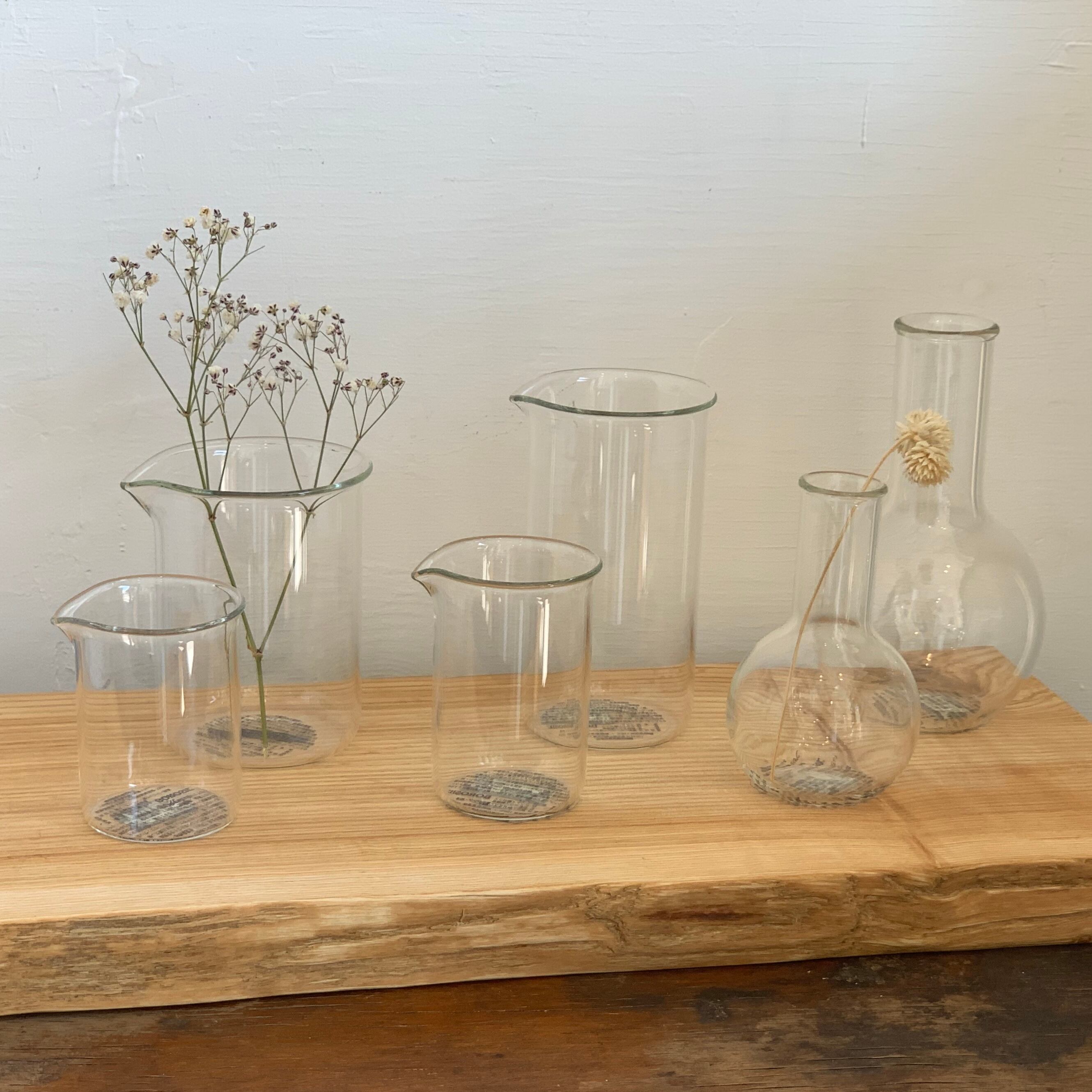 プリントがなくなったことで、ビーカーやフラスコの機能美の形状が引き立ち、インテリアにもすっとなじみます。