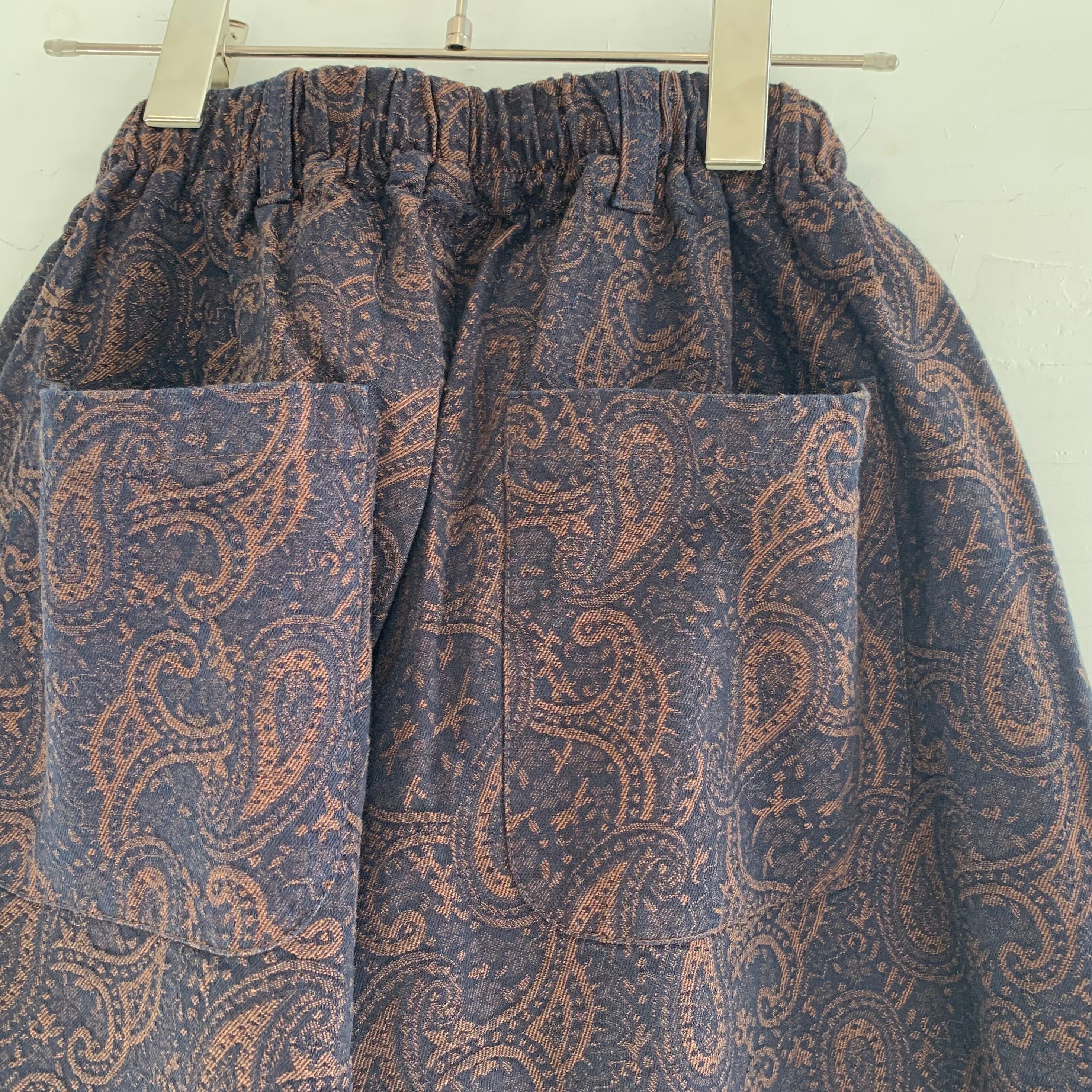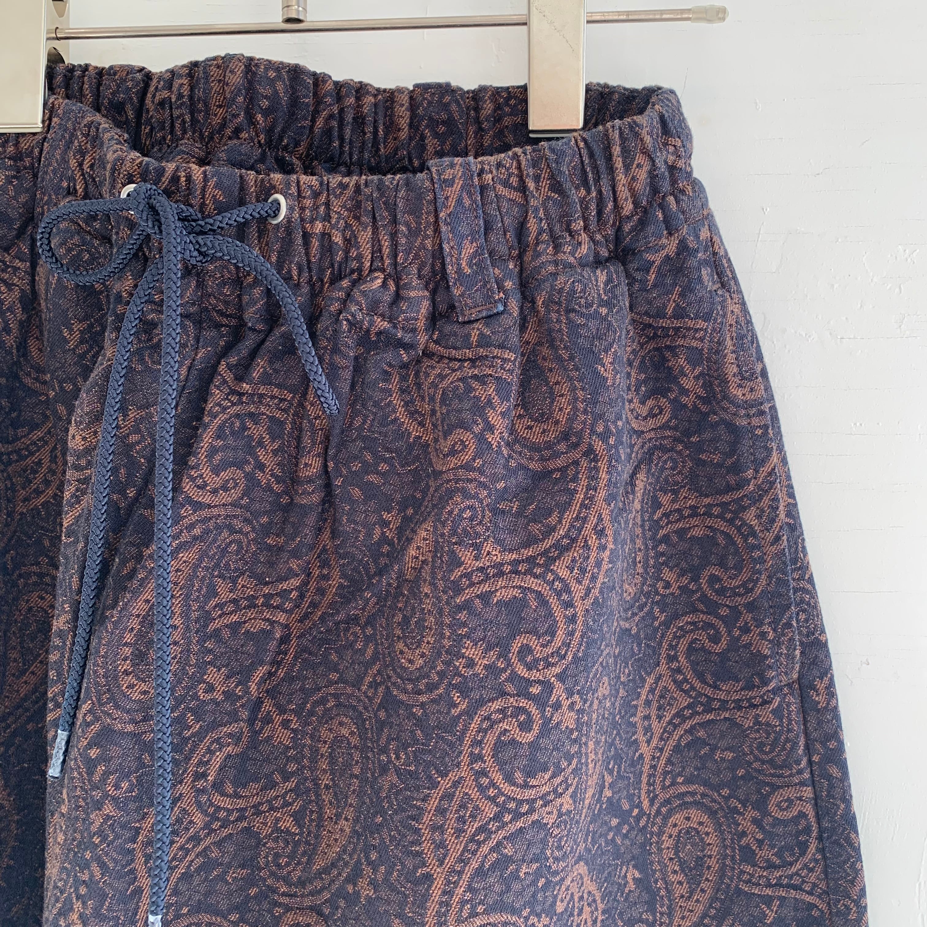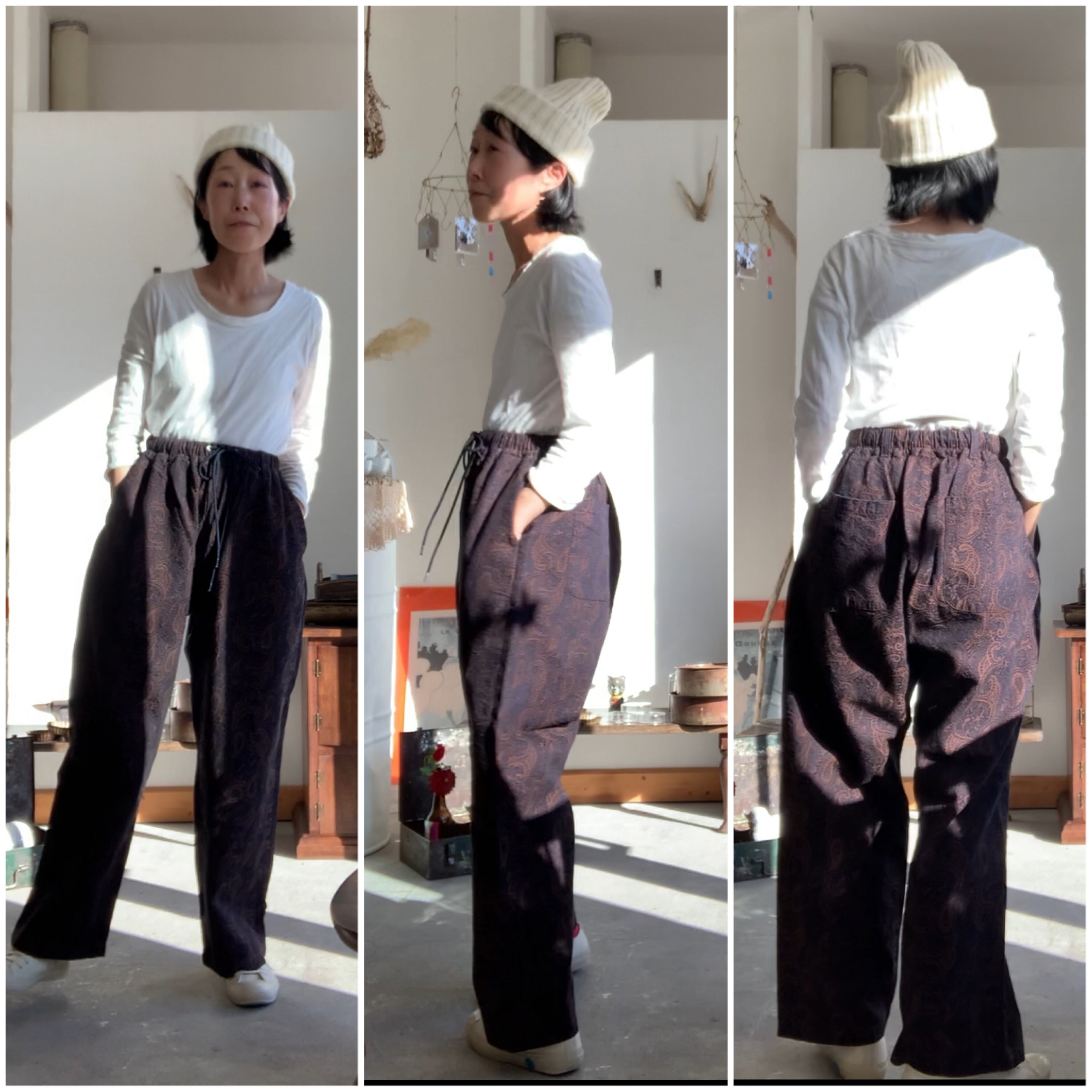 ゆったりとしてテーパーとシルエットが特徴で、ウエストはゴムと組で調整が可能です。