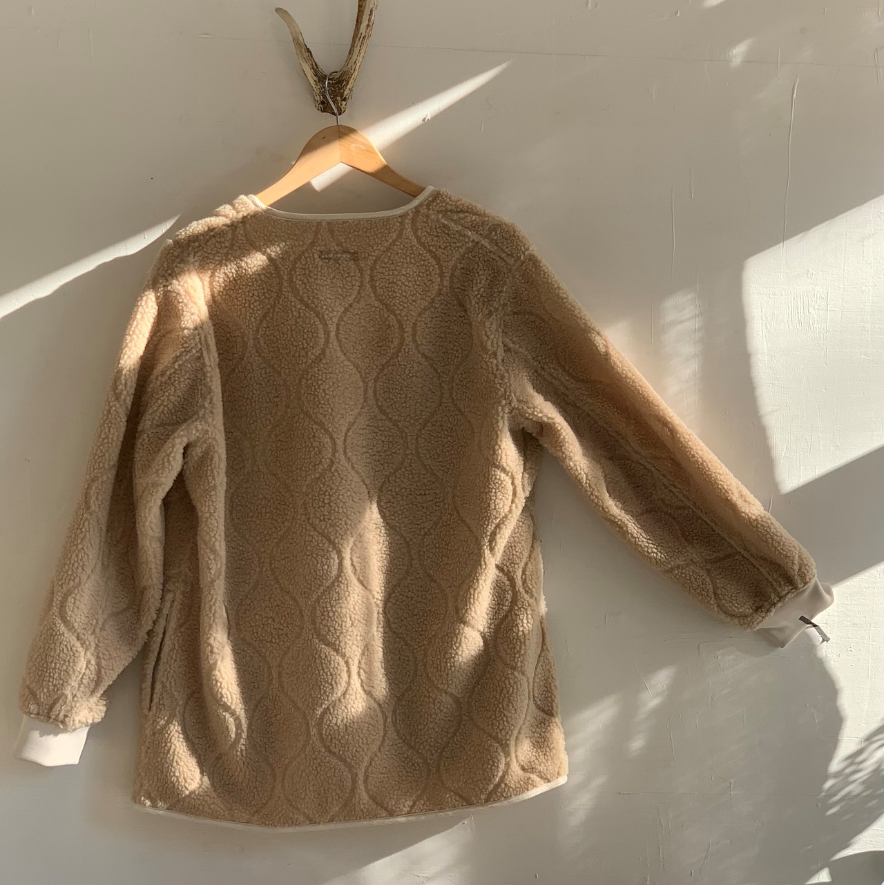 前見頃が重なるデザインなので、保温性が高く、軽量で羽織りやすいジャケットです。