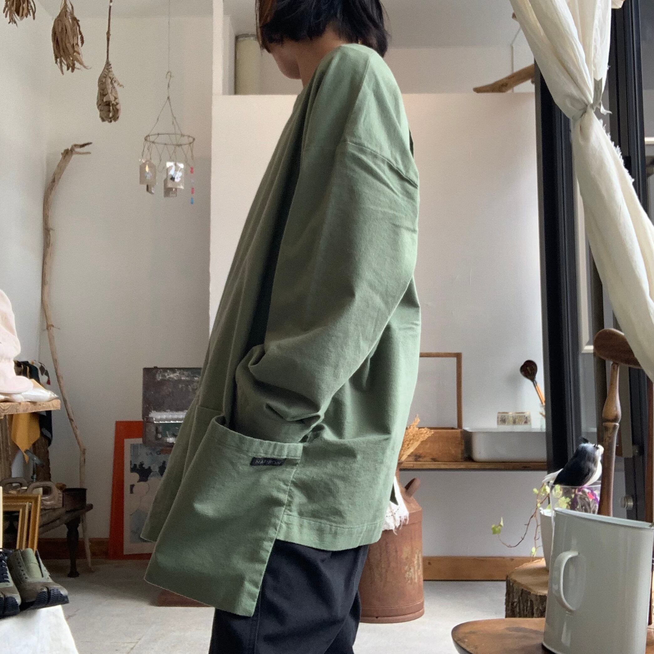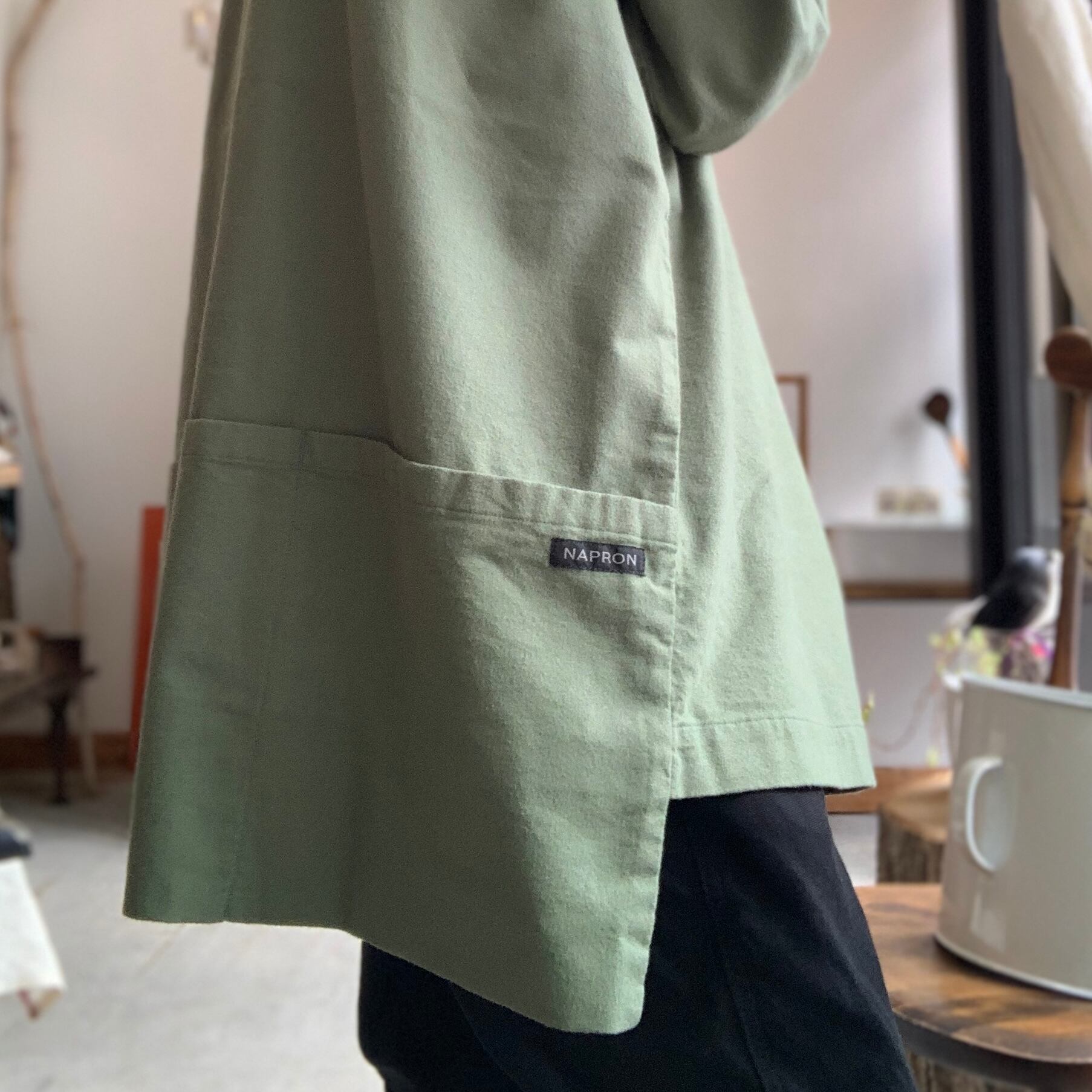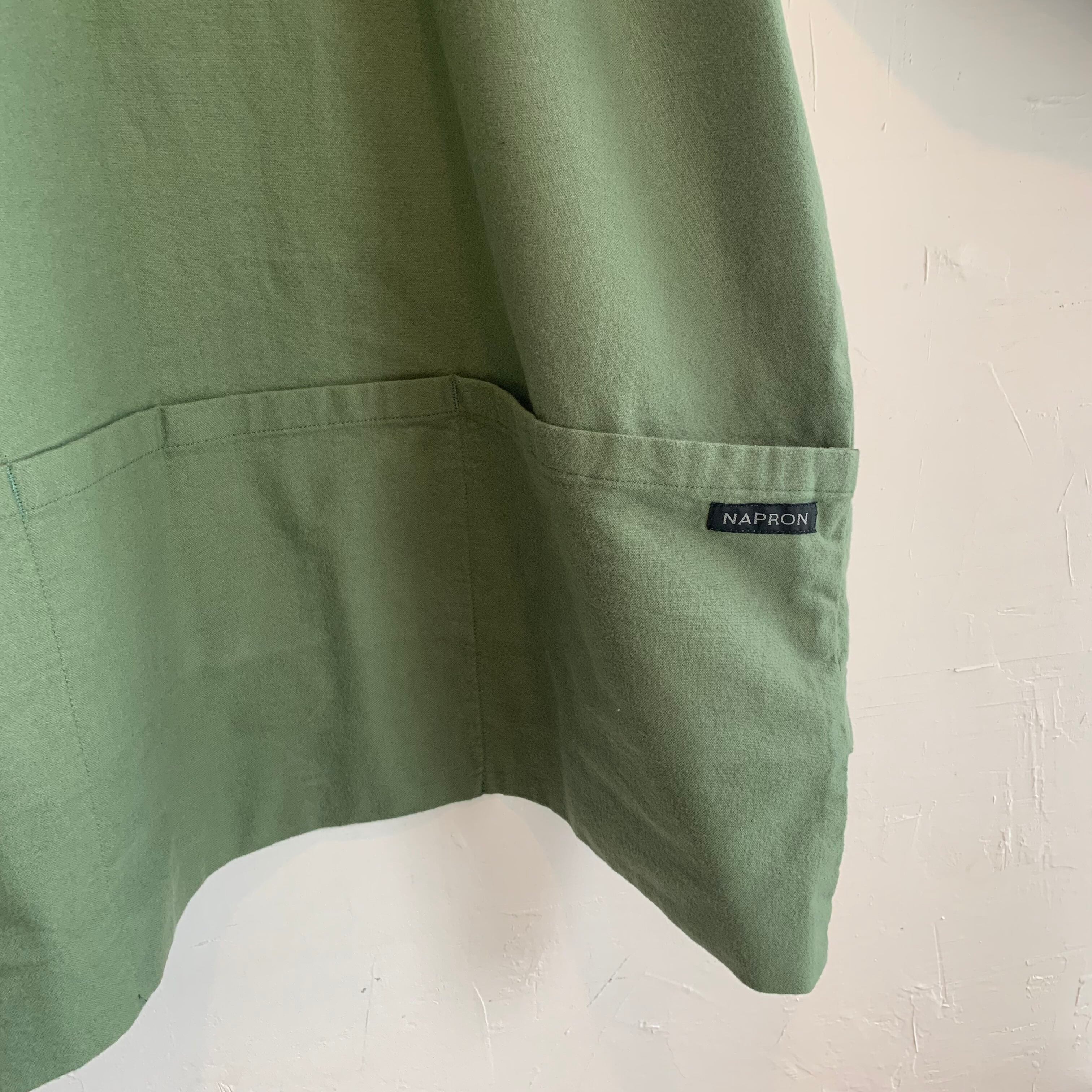 フロントに大きなエプロンポケットを配置したエプロンシャツです。